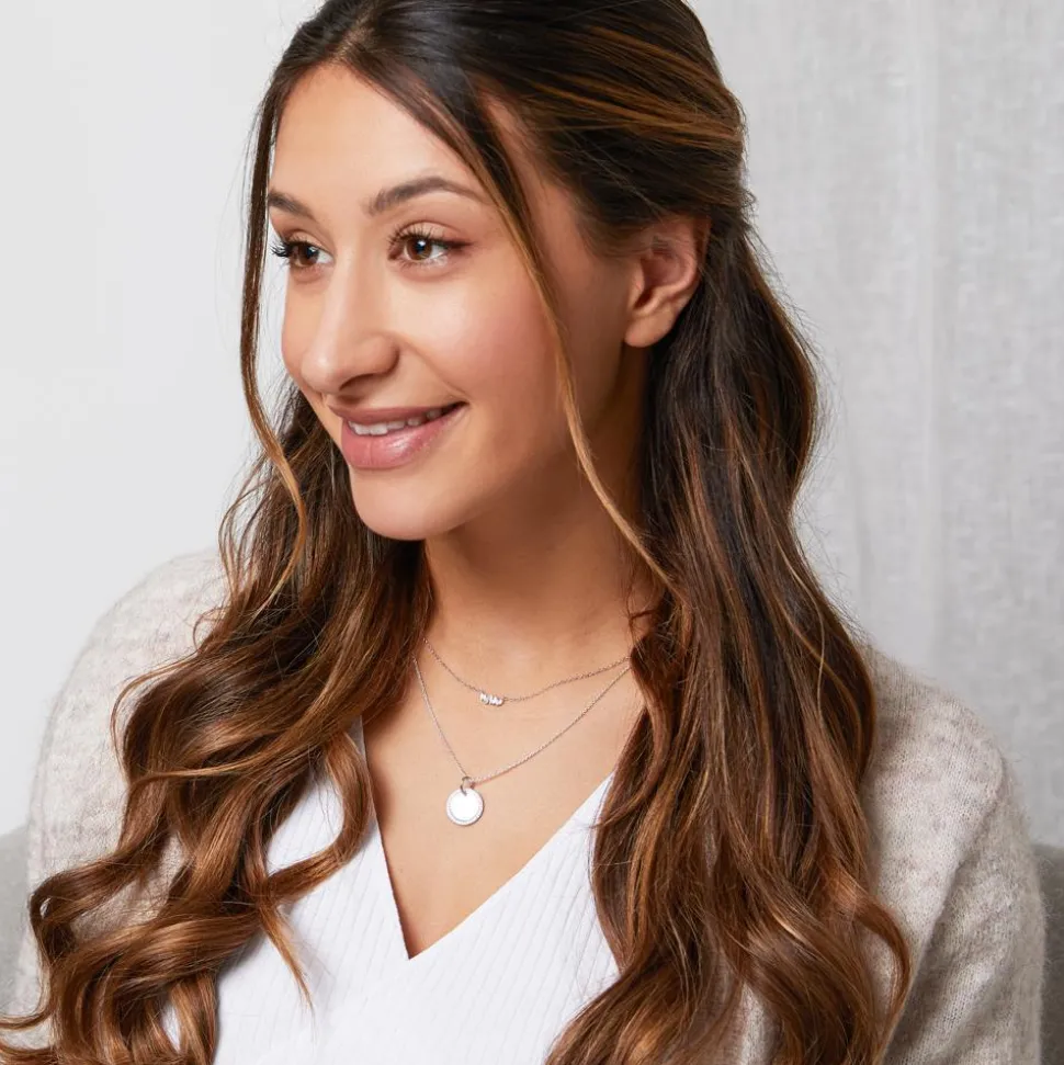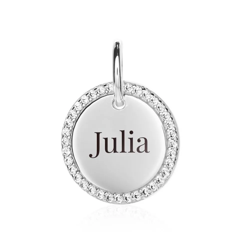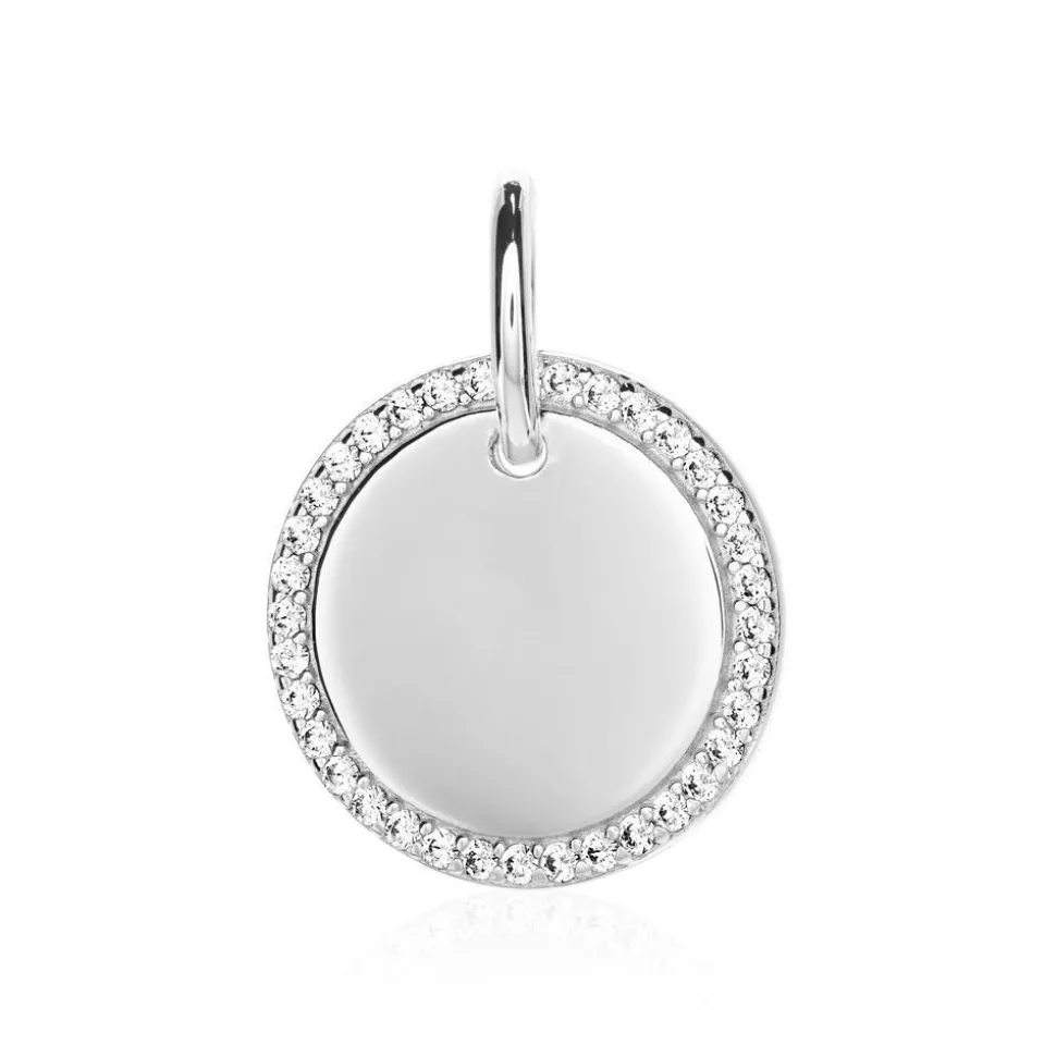 Schlichte Eleganz – das versprüht dieser runde Anhänger für Damen. Er ist aus Sterlingsilber gefertigt und wird von weiß-funkelnden Zirkoniasteinen geziert. Zudem kann die Vorderseite individuell graviert werden.
