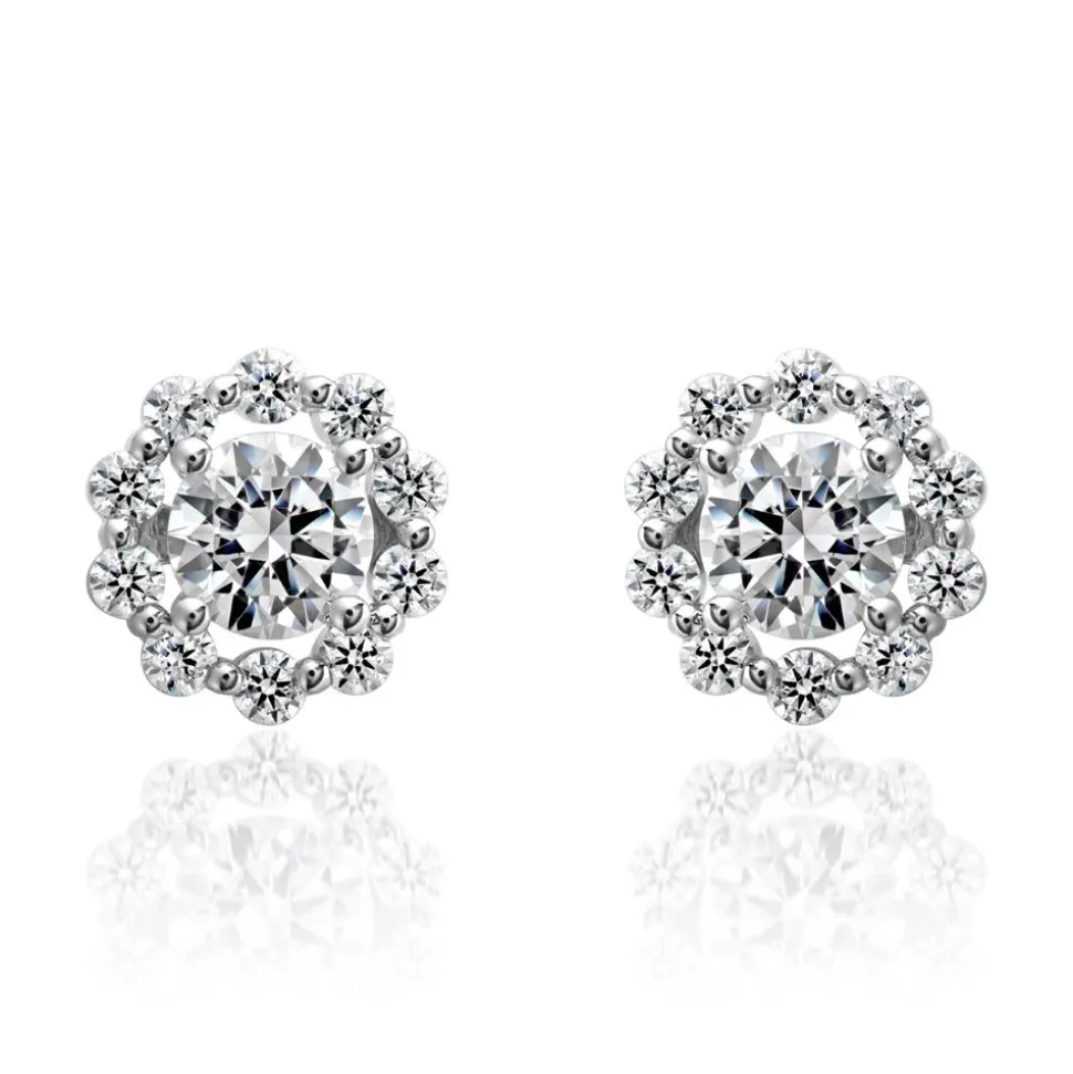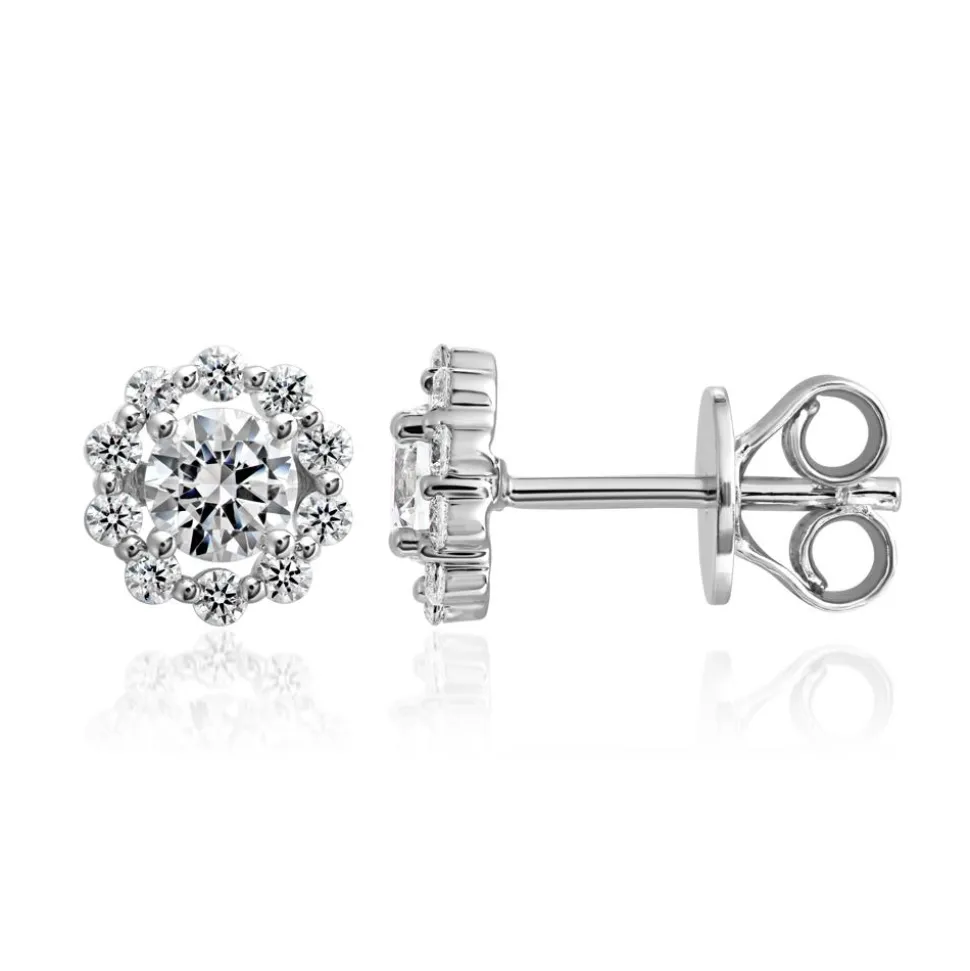 Diese Ohrstecker für Damen sind einfach bezaubernd. Sie sind entweder aus Weißgold (14 Karat oder 18 Karat) oder 950er Platin gefertigt. Das Material ist über das Drop-down-Feld individuell auswählbar. Die Ohrringe bestehen jeweils aus einem zentralen Diamanten mit ca. 0,30 ct., der von vier Krappen gehalten wird und von einem Halo-Rahmen aus 10 kleineren Diamanten (ca. 0,16 ct. pro Stecker) umgeben ist. Durch die kleinen Diamanten erhalten die Ohrstecker ein wundervolles Blüten-Design. Jeder der Diamanten besitzt eine hohe Reinheit (small inclusions) und die Farbe „Top Wesselton“. Ihre Herkunft ist selbstverständlich konfliktfrei, da wir großen Wert auf ethische Kriterien legen. Ein Zertifikat von dem renommierten Gemological Institute of America (GIA) gibt zudem Auskunft über alle wertbestimmenden Eigenschaften der zwei Hauptdiamanten.