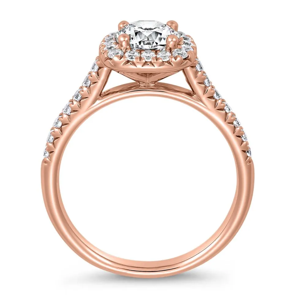 Dieser Verlobungsring für Damen im Halo-Stil ist absolut zauberhaft. Er ist wahlweise aus 14 Karat oder 18 Karat Roségold gefertigt und mit lab-grown Diamanten besetzt. Im Zentrum strahlt ein ca. 0,70 ct. großer lab-grown Diamanten. Er wird von einem quadratischen Rahmen aus weiteren Diamanten umgeben, die seine Strahlkraft noch verstärken. An den Seiten der Ringschiene befinden sich weitere Labordiamanten. Insgesamt sind noch 30 kleine lab-grown Diamanten mit insgesamt ca. 0,39 ct. auf dem Ring eingefasst. Sie weisen alle die Farbe D-F auf und besitzen kaum Einschlüsse (VVS-VS). Durch ein innovatives Verfahren im Labor gezüchtet, verfügen die lab-grown Diamanten über die gleiche Härte und die gleiche Brillanz wie natürliche Diamanten. Das IGI-Zertifikat gibt Auskunft über alle wertbestimmenden Eigenschaften des Hauptdiamanten (G/SI). Der Ring kann auf der Innenseite individuell graviert werden. Die Legierung und Gravur kann über das Drop-down-Feld ausgewählt werden.
