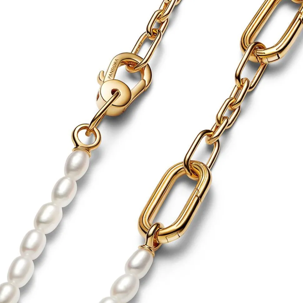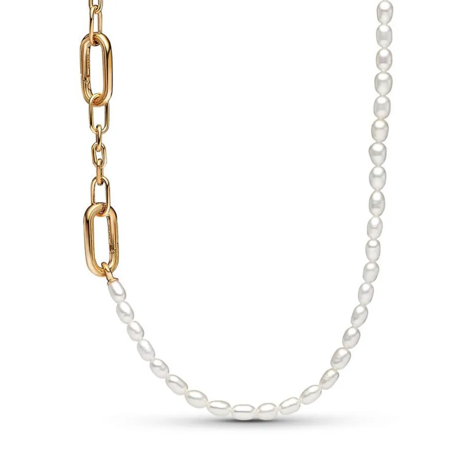 Das moderne Design dieser Perlenkette für Damen begeistert. Die Kette besteht auf einer Seite aus barocken Süßwasserperlen und wird durch eine Gliederkette aus einer vergoldeten Metalllegierung ergänzt. Zwei gerillte Styling-Connectors und ein Karabinerverschluss sorgen für zahlreiche Kombinationsmöglichkeiten. Durch das Hinzufügen und Herausnehmen von einzelnen Elementen kann die Länge der Kette verändert werden. Einen zusätzlichen Blickfang schaffen verschiedene Medaillons oder Mini-Dangles aus der ME-Kollektion, welche an die Styling-Connectors gehängt werden können.