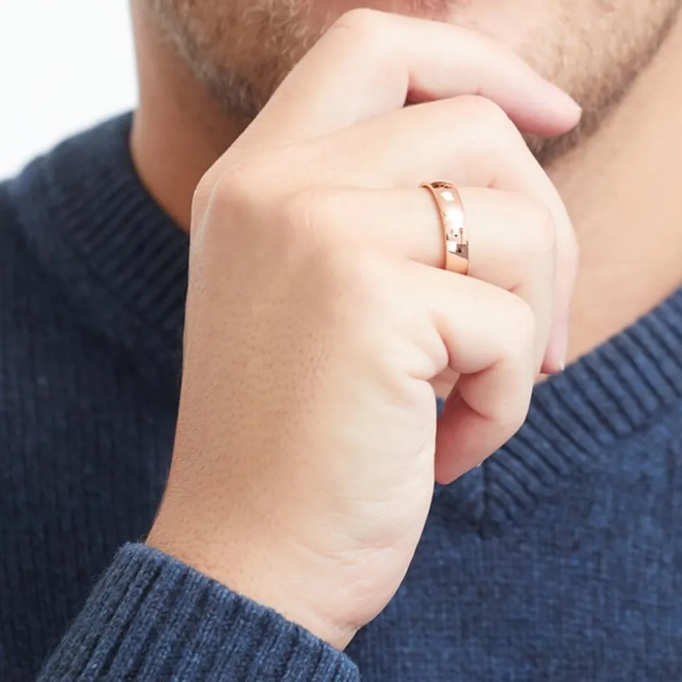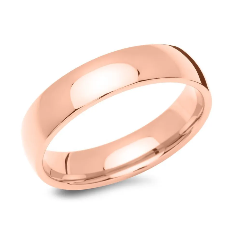 Rosévergoldeter Herrenring aus widerstandsfähigem Edelstahl. Der Ring ist 5mm breit. Dank der bombierten Innenseite lässt sich der Ring sehr angenehm tragen. Der Ring kann mit einer Diamantgravur oder alternativ Lasergravur versehen werden.