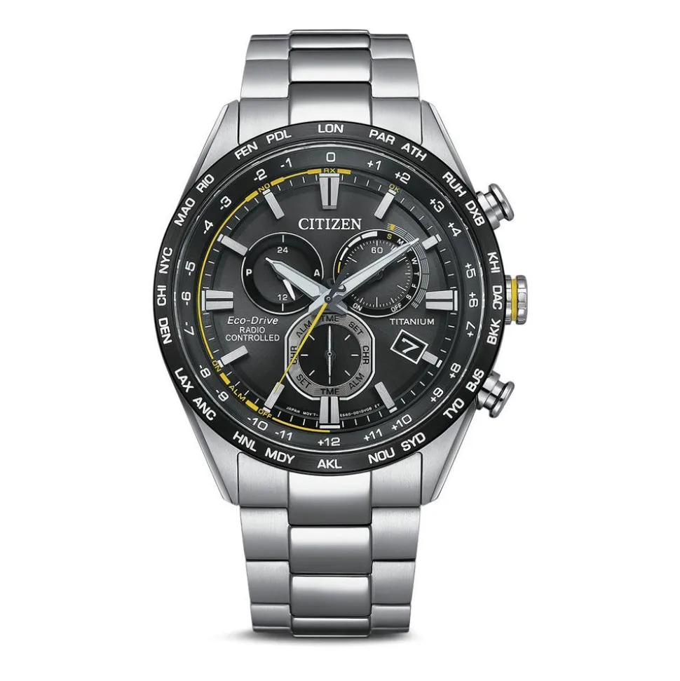 Ein stylisher Alleskönner – das ist dieser Chronograph für Herren. Aus satiniertem Super Titanium gefertigt, zeichnet sich die Quarzuhr vor allem durch ihren Eco-Drive Solarantrieb aus. Dieser nutzt einfallendes Tages- oder Kunstlicht als Antriebsenergie, weshalb die Uhr keinen Batteriewechsel benötigt (300 Tage Gangreserve, 3 Jahre Dunkelgangreserve). Die Uhr verfügt über eine Datums-, Wochentags- und 24-Stundenanzeige, einen ewigen Kalender, eine Stoppfunktion und einen Tagesalarm und sie kann die Ortszeit von 24 Städten anzeigen (Funkempfang in Europa, China, Japan und den USA). Das schwarze Zifferblatt wird von kratzfestem Saphirglas geschützt und von einer schwarzen Lünette umgeben, die die Kürzel der Städtenamen trägt. Gelbe Details auf dem Zifferblatt und der Krone setzen einen ansprechenden Akzent. Eine sichere Faltschließe sorgt für einen guten Halt am Handgelenk. 10 ATM.