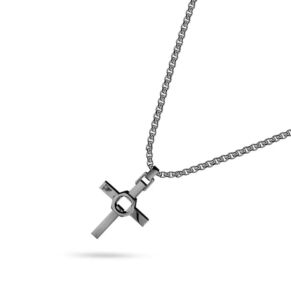 Ein stylishes Accessoire voller Symbolkraft – das ist diese Venezianerkette für Herren. Sie besteht aus Edelstahl und besitzt eine dunkelgraue IP-Beschichtung. Highlight der Kette ist der stilisierte Kreuzanhänger. Dieser besitzt Längs- und Querstreben, die von einem eckigen Edelstahlring, welcher an eine Schraubenmutter erinnert, zusammengehalten werden. Die Länge der Kette ist verstellbar, indem man das integrierte Kettenelement herausnimmt. Ein Karabinerverschluss sorgt für guten Halt.