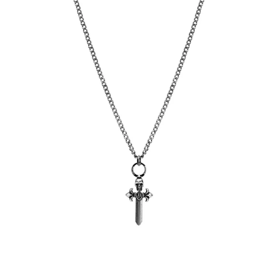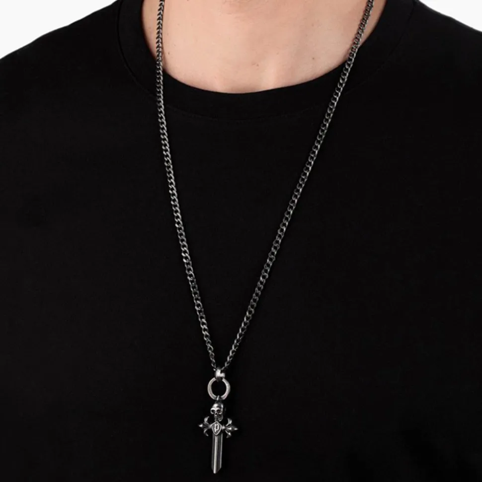 Diese Gliederkette für Herren aus Edelstahl ist ein markanter Blickfang. Highlight ist der stilisierte Kreuzanhänger: Den oberen Teil bildet ein mit Police graviertes Kreiselement, welches in einen Totenkopf übergeht. Die seitlichen Streben bestehen aus den markentypischen Lilien, mittig sitzt das Markenlogo, welches dann in die senkrechte des Kreuzes übergeht und an eine Schwertklinge erinnert. Geschlossen wird die Kette mit einem Karabiner.