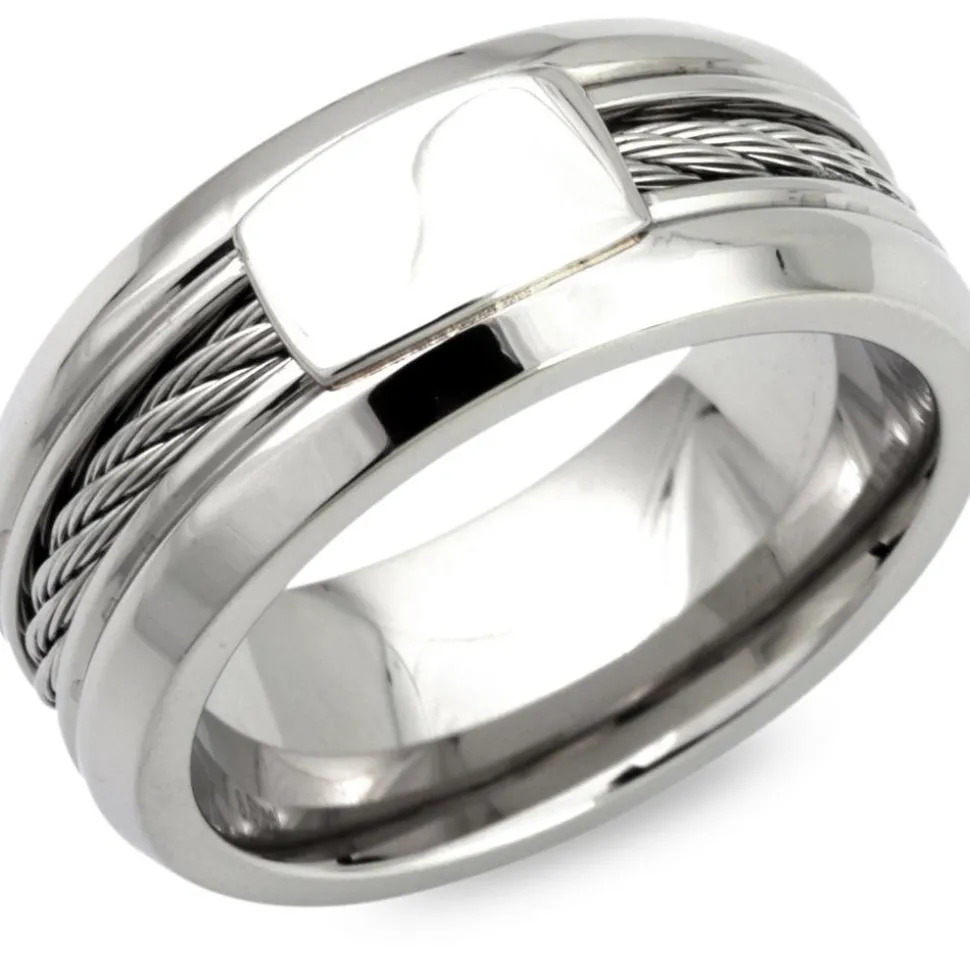 Moderner Edelstahlring in polierter Ausführung mit einer hellen Stahlseileinlage und einer Glanzplatte. Der Ring kann gegen einen Aufpreis von Innen graviert werden.