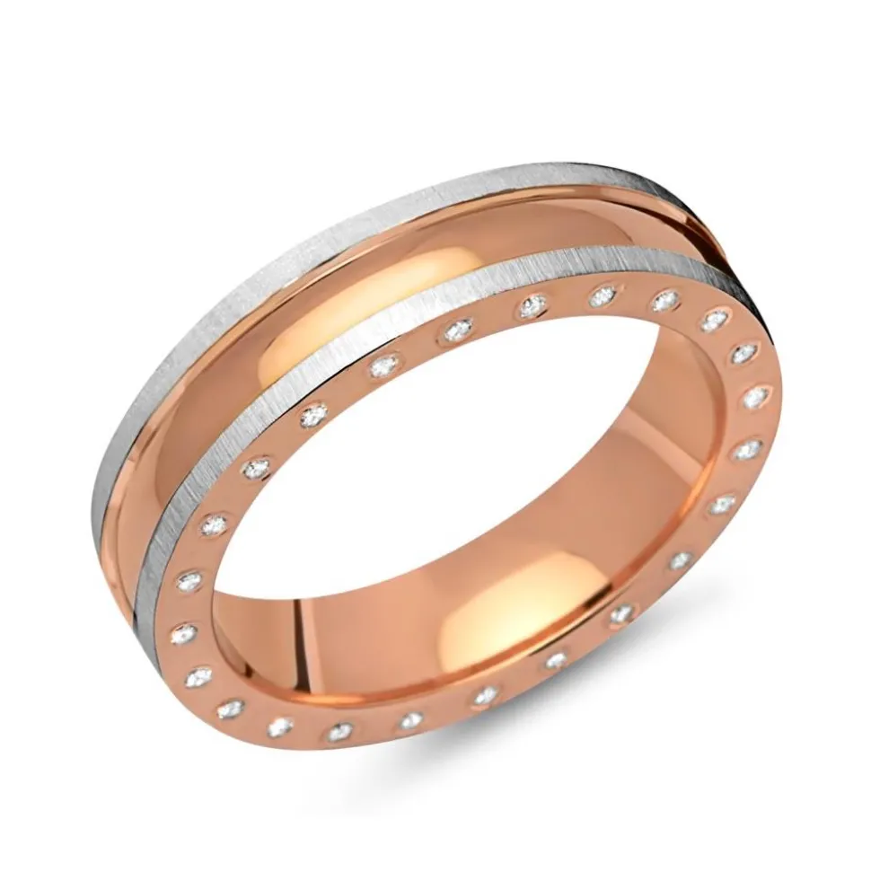 Hochwertiger Damenring aus anlaufgeschütztem 925er Sterlingsilber. Der Ring besitzt eine anlaufgeschützte sowie teilvergoldete Oberfläche. An seinen Seiten ist er mit 48 Zirkonia besetzt. Sie können den Ring zudem mit einer individuellen Innengravur versehen lassen.