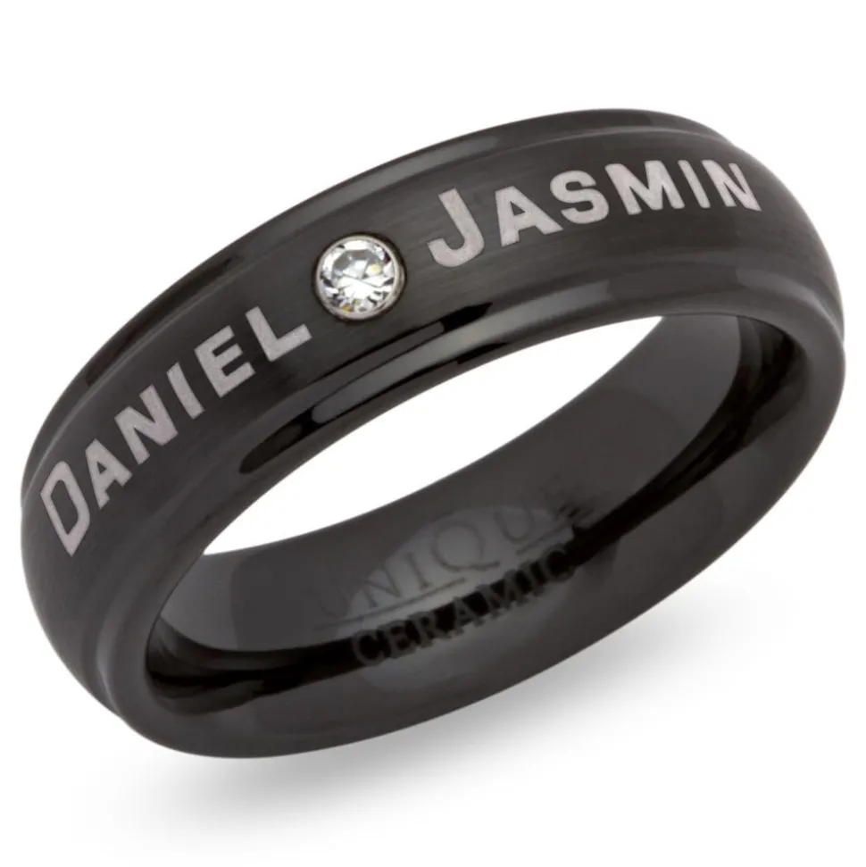 Trendstark – schwarzer Keramik-Gravurring mit weißem Zirkonia
