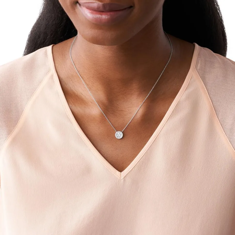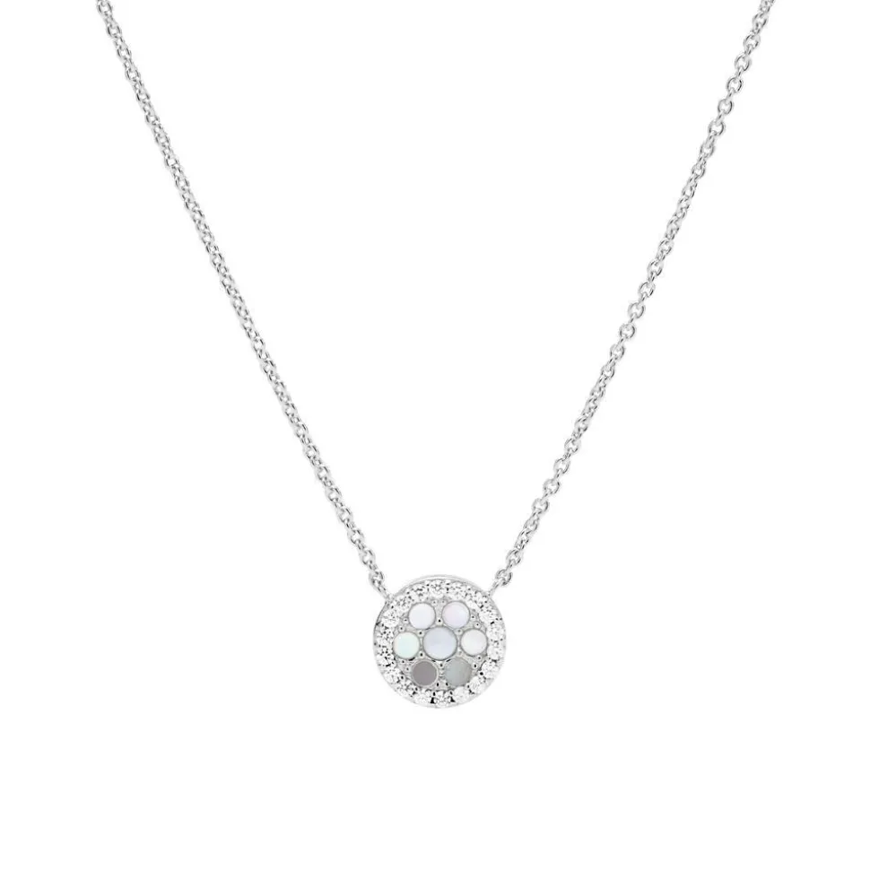 Unaufgeregt elegant – das ist diese Damenkette. Sie besteht aus Sterlingsilber und zwischen die filigranen Ankerkettenglieder ist ein runder Anhänger gearbeitet, welcher auf der Vorderseite von weißen Glassteinen und Perlmutt-Plättchen geziert wird. Die Rückseite des Anhängers kann mit einer Gravur individualisiert werden. Geschlossen wird die Kette mit einem Karabiner und sie kann durch die Zwischenösen in der Länge reguliert werden.