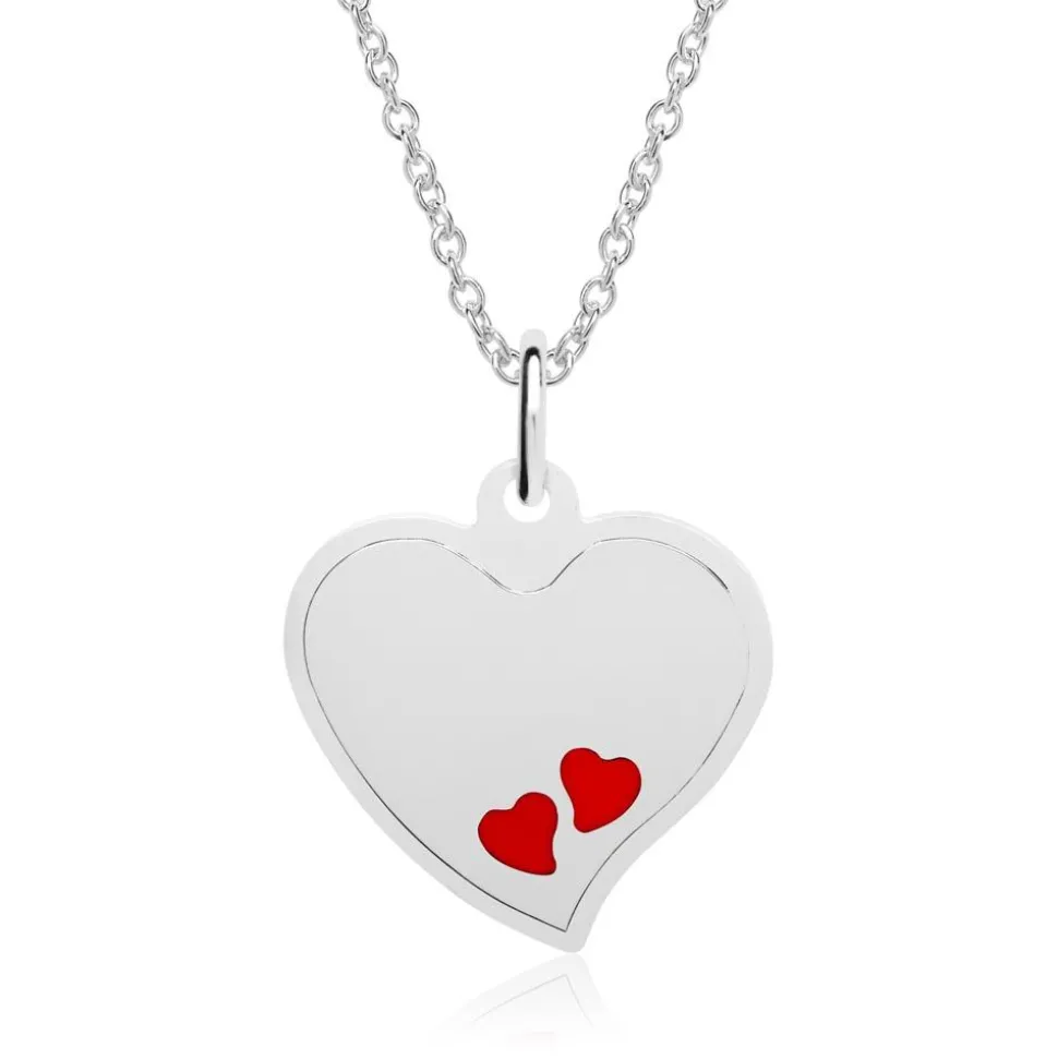 Diese ansprechende Kette mit einem Anhänger im Herzdesign zaubert sicher jeder Frau ein Lächeln ins Gesicht. Sie besteht aus poliertem 925er Sterlingsilber und eignet sich perfekt dazu sie zu verschenken oder aber sich selbst eine Freude zu machen. Das liegt nicht nur an der Herzform und den beiden kleinen Herzen aus roter Emaille, sondern auch daran, dass der Anhänger individualisiert werden kann. Sowohl die Vorder- als auch die Rückseite kann von uns mit einem persönlichen Wunschtext, wie einer Widmung, einem Namen oder Datum graviert werden. Somit entsteht ein ganz individuelles und einzigartiges Schmuckstück.