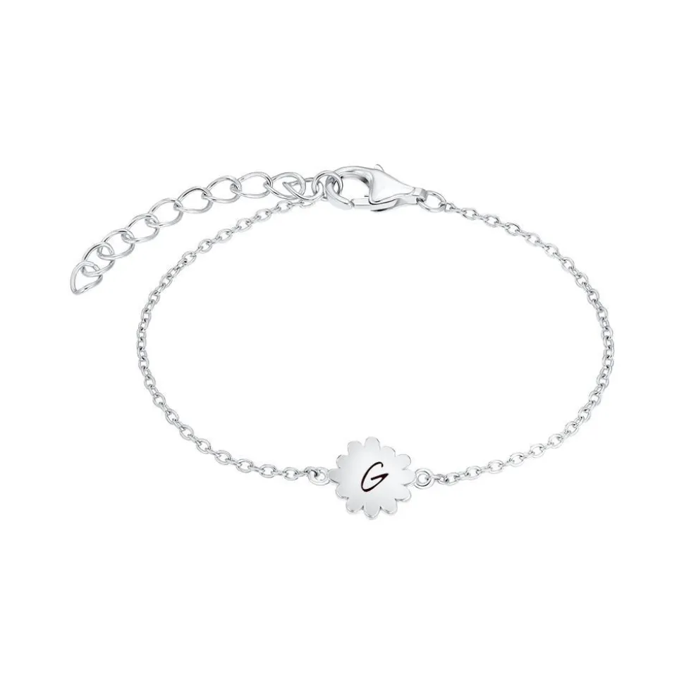 Ein floraler Blickfang – das ist dieses Armband für Kinder aus rhodiniertem Sterlingsilber. Zwischen die filigranen Ankerkettenglieder ist eine Blüte eingearbeitet, die mit weißer und gelber Emaille beschichtet ist. Zudem kann die Blume auf der Rückseite graviert werden. Die Armkette besitzt einen Karabiner als Verschluss und kann in der Länge verstellt werden.