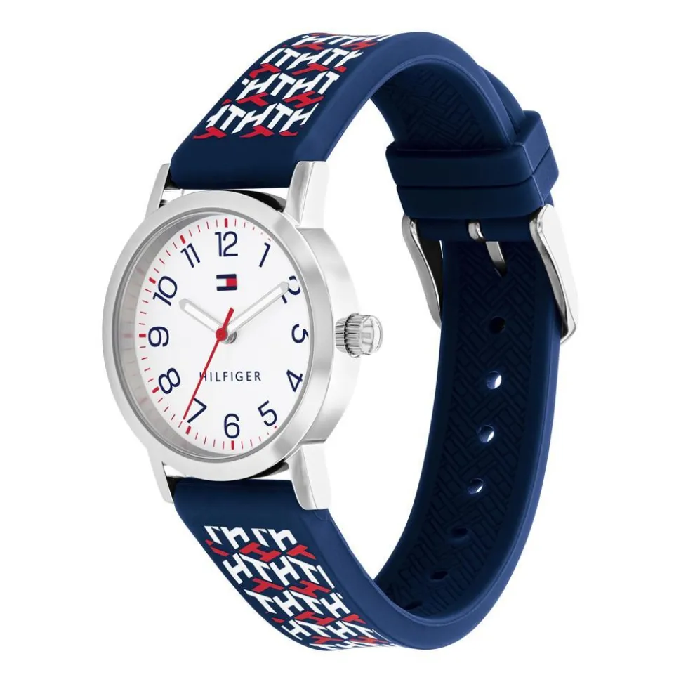 Diese stilvolle Kinderuhr besitzt ein Gehäuse aus Edelstahl mit einem Quarzantrieb, welches bis zu einem Druck von 5 bar wasserdicht ist. Das Gehäuse wird von einem weichen Silikonband in blauer Farbe gehalten, auf dem sich ein Muster aus den weißen und roten Initialen der Marke befindet. Das weiße Zifferblatt besitzt rote Strichindizes und trägt deutlich lesbare Zahlen in Blau. Für einen sicheren Halt sorgt die praktische Dornschließe.