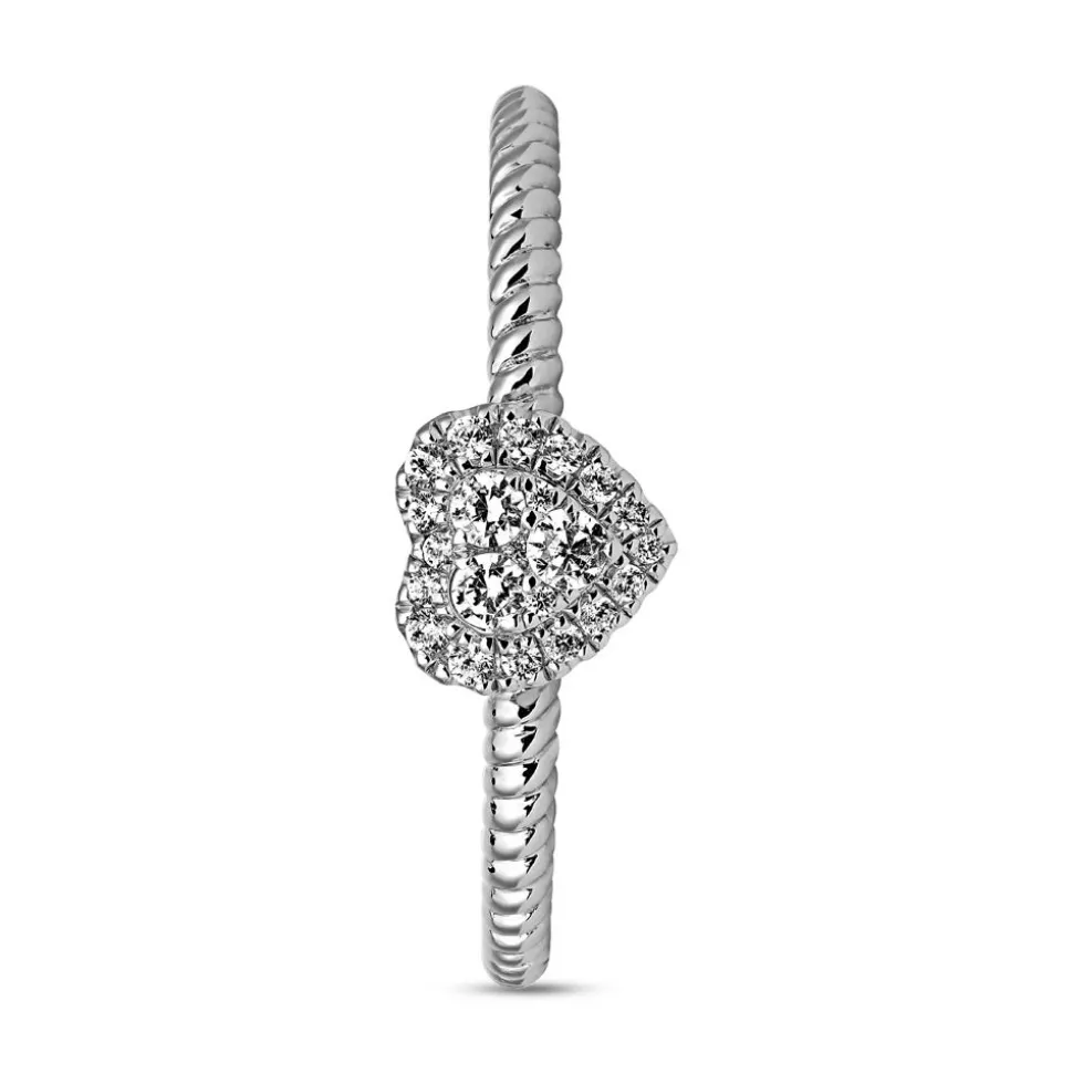 Einfach wunderschön – das ist dieser Herzring für Damen. Er steht in Weißgold (14 oder 18 Karat) oder Platin (950er) zur Auswahl und verfügt über eine Ringschiene im Kordel-Design. Der Ringkopf in Herzform trägt in der Mitte ein Pavé aus unterschiedlich großen Diamanten, welches von einem Halo-Kranz aus weiteren Diamanten umgeben ist. Das Gesamtgewicht der 22 Brillanten beträgt ca. 0,13 ct. und ihre Farbe gehört zur Kategorie „Top Wesselton“. Die Reinheit entspricht der Klasse „small inclusions“ und ihre Herkunft ist selbstverständlich konfliktfrei. Mithilfe der Drop-down-Liste kann die gewünschte Legierung ausgesucht werden.