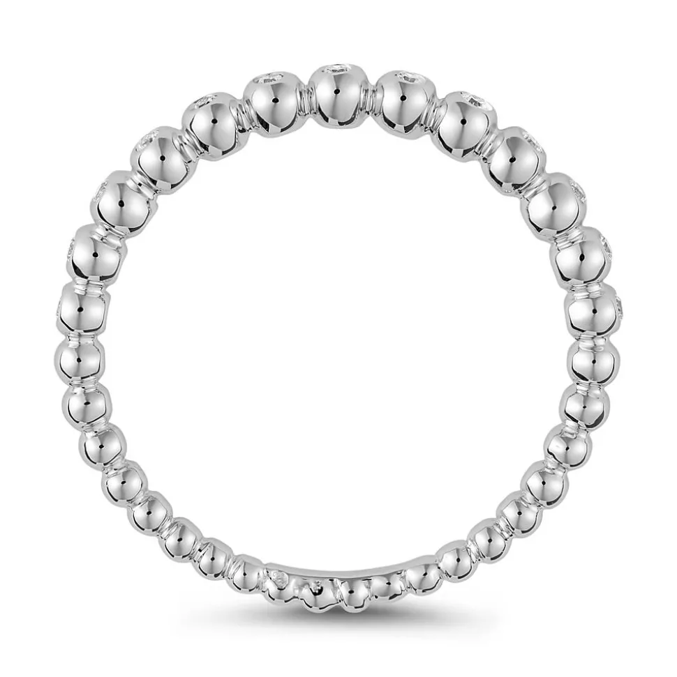 Mit einem außergewöhnlichen Design begeistert dieser Diamantring für Damen. Er steht entweder in einer 14- oder 18-karätigen Weißgoldlegierung oder in 950er Platin zur Verfügung. Seine Ringschiene besteht aus aneinandergereihten Kugelelementen und ist im vorderen Teil mit Diamanten besetzt. Die 13 Brillanten weisen ein Gesamtgewicht von ca. 0,08 ct. auf. Ihre Farbe ist als „Top Wesselton“ und ihre Reinheit als „small inclusions“ klassifiziert. Zudem verfügen sie allesamt über einen konfliktfreien Ursprung. Die Auswahl der Legierung kann über das Drop-down-Feld getroffen werden.