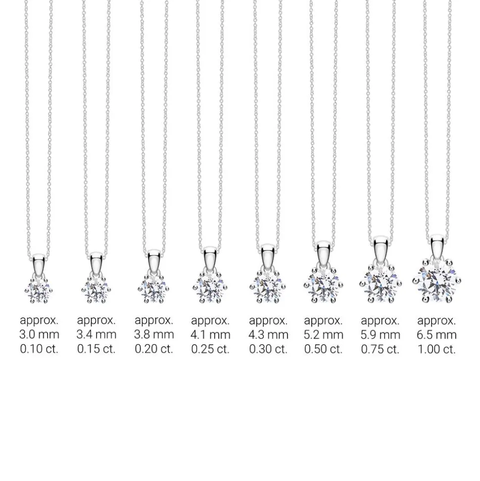 Absolut edel – das ist dieser Anhänger aus 14-karätigem Weißgold mit lab-grown Diamant im Brillantschliff. Dieser steht in verschiedenen Größen zur Verfügung. Unsere lab-grown Diamanten bestehen, wie natürliche Diamanten, aus Kohlenstoff und besitzen auch sonst alle Eigenschaften eines abgebauten Diamanten, sind aber ressourcenschonender. Ab einer Steingröße (-gewicht) von 0,30 ct. liegt dem Schmuckstück ein Zertifikat von dem renommierten International Gemological Institute (IGI) bei. Dieses Zertifikat gibt Auskunft über die Herkunft, Echtheit und alle weiteren wertbestimmenden Merkmale. Des Weiteren erhält jeder Anhänger ein Brilladia-Zertifikat. Die Qualität für das jeweilige Steingewicht der lab-grown Diamanten ist in der nachfolgenden Tabelle aufgeführt.