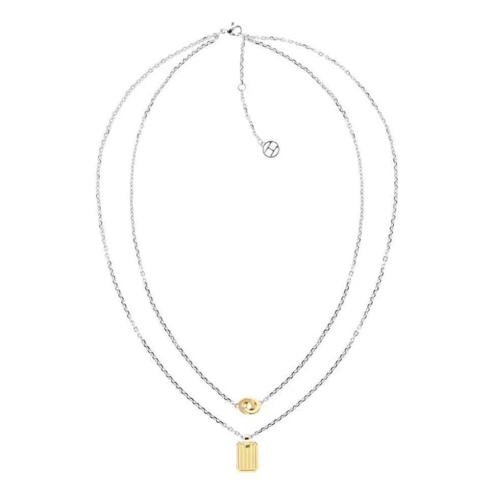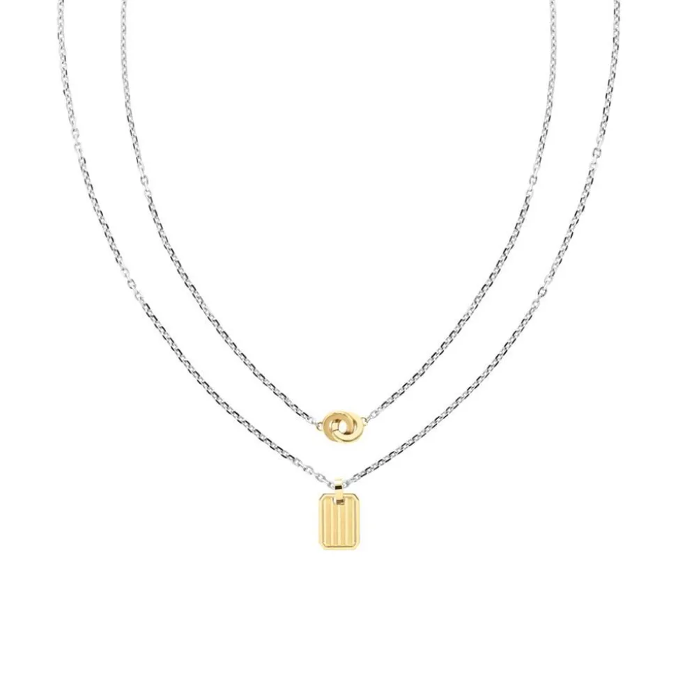 Ein moderner Eyecatcher – das ist diese Kette für Damen aus Edelstahl. Sie besteht aus zwei Kettenreihen: die kürzere wird von zwei vergoldeten Ringen, die ineinander geschlungen sind, geziert. Die längere Kette besitzt als Anhänger ein rechteckiges Schmuckelement mit abgeflachten Ecken und IP Vergoldung. Die Vorderseite hat ein Streifen-Design und die Rückseite kann graviert werden. Seitlich befindet sich die markentypische Flagge aus blauer, roter und weißer Emaille. Die Halskette besitzt einen Karabinerverschluss und kann durch die Zwischenösen in der Länge reguliert werden. Den Abschluss der Verlängerung bildet das Markenlogo in Form eines runden Anhängers.
