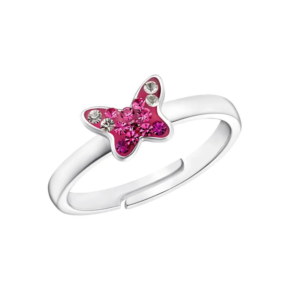 Das wundervolle Motiv eines Schmetterlings ziert diesen Ring für Mädchen. Der Ring besteht aus Sterlingsilber und wird durch eine Rhodiumbeschichtung vor dem Anlaufen geschützt. Auf der Vorderseite des Schmetterlings befinden sich zahlreiche magentafarbene Zirkoniasteine sowie Zirkoniasteine in weißer und violetter Farbe. Da die Weite der Ringschiene variabel ist, schmiegt sich der Ring angenehm an die Finger an.