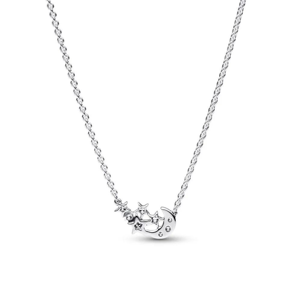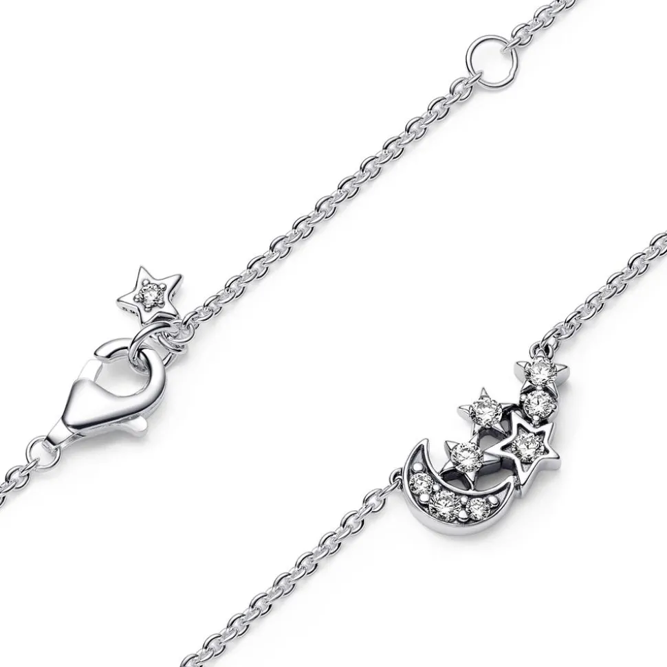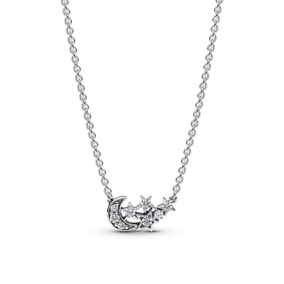 Diese Halskette für Damen ist ein wunderschöner Blickfang. Die Ankerkette besteht aus Sterlingsilber und besitzt ein eingearbeitetes Schmuckelement im Design eines Monds, der von Sternen begleitet wird. Das Schmuckelement wird von weißen Zirkoniasteinen geziert. Ein weiterer Zirkoniastein befindet sich am Ende der Kette. Die Länge der Kette lässt sich anpassen und verschlossen wird sie mit einem Karabiner.