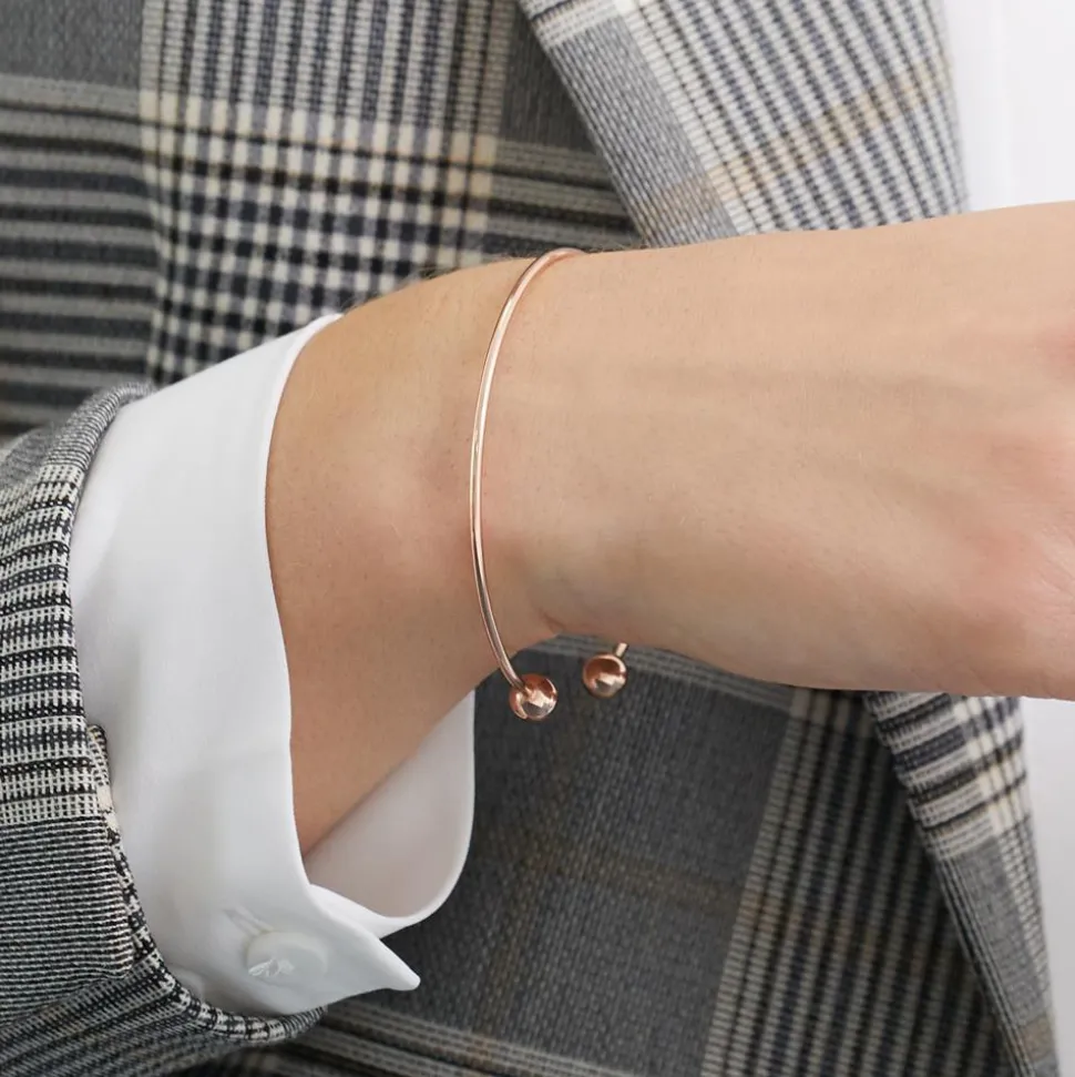 Dieser Armreif ist ein absolut stylisher Begleiter für jeden Tag. Er ist aus rosévergoldetem Sterlingsilber gefertigt, offen gestaltet und besitzt zwei Kugeln als Abschlüsse. Der Armreif kann von Damen und Herren gleichermaßen getragen werden.