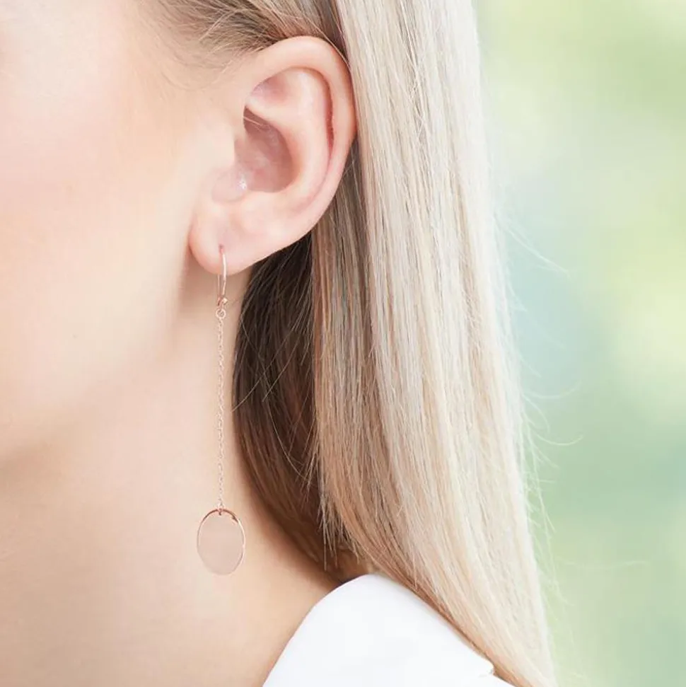 Diese Ohrhänger sind absolut stylish! Sie sind aus rosévergoldetem 925er Silber gefertigt und besitzen jeweils einen runden Anhänger, wovon beide auf der Vorder- und Rückseite mit einer Gravur versehen werden können.