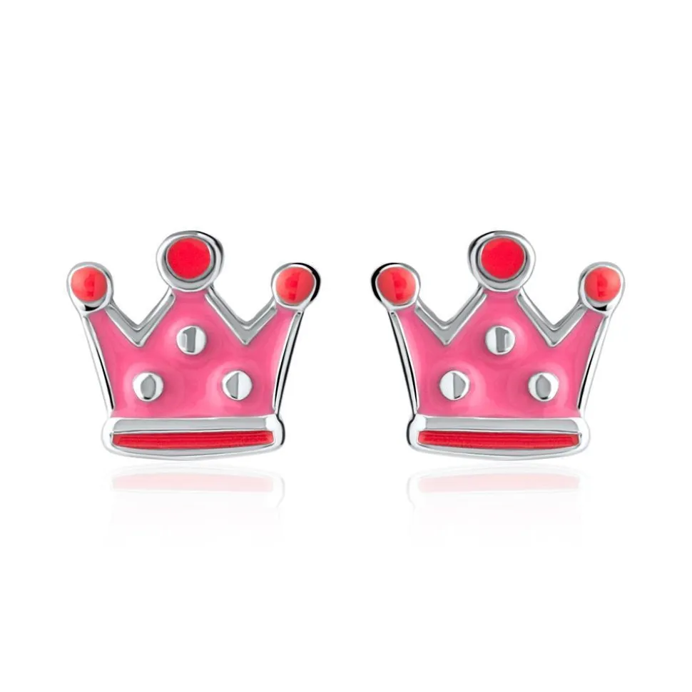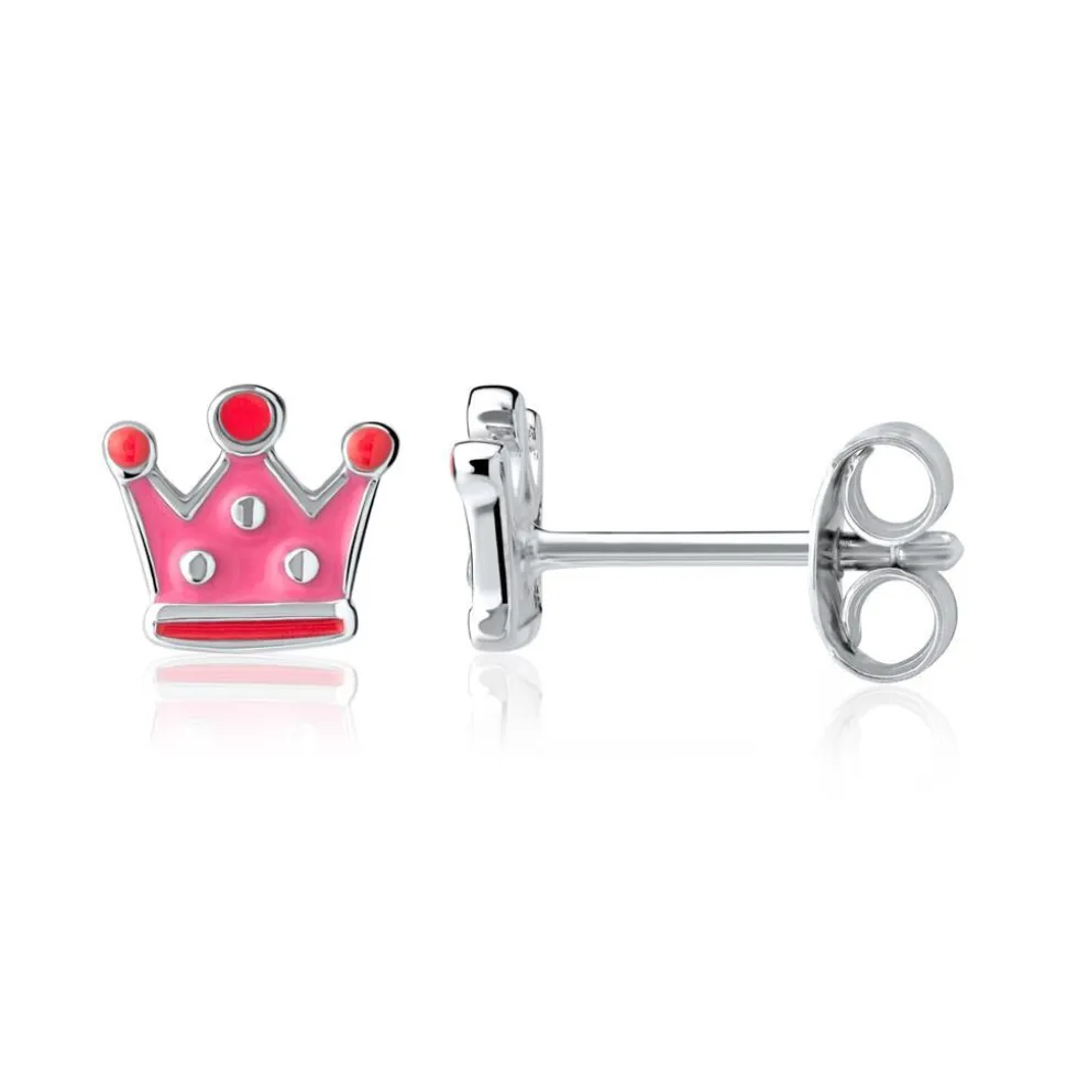 Diese Ohrstecker sind absolute Must-haves für kleine Prinzessinnen! Sie besitzen ein niedliches Kronendesign und sind aus rhodiniertem 925er Silber gefertigt. Die Kronen sind zudem mit rosafarbener und pinker Emaille akzentuiert.