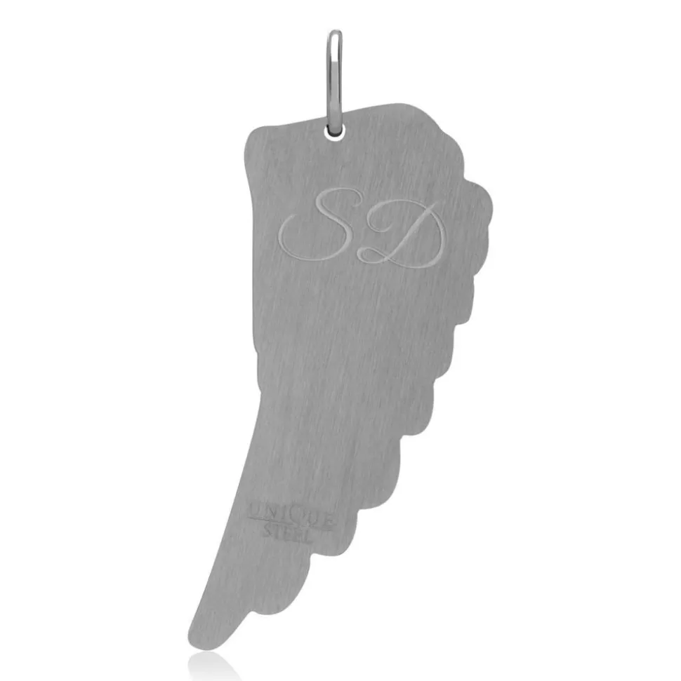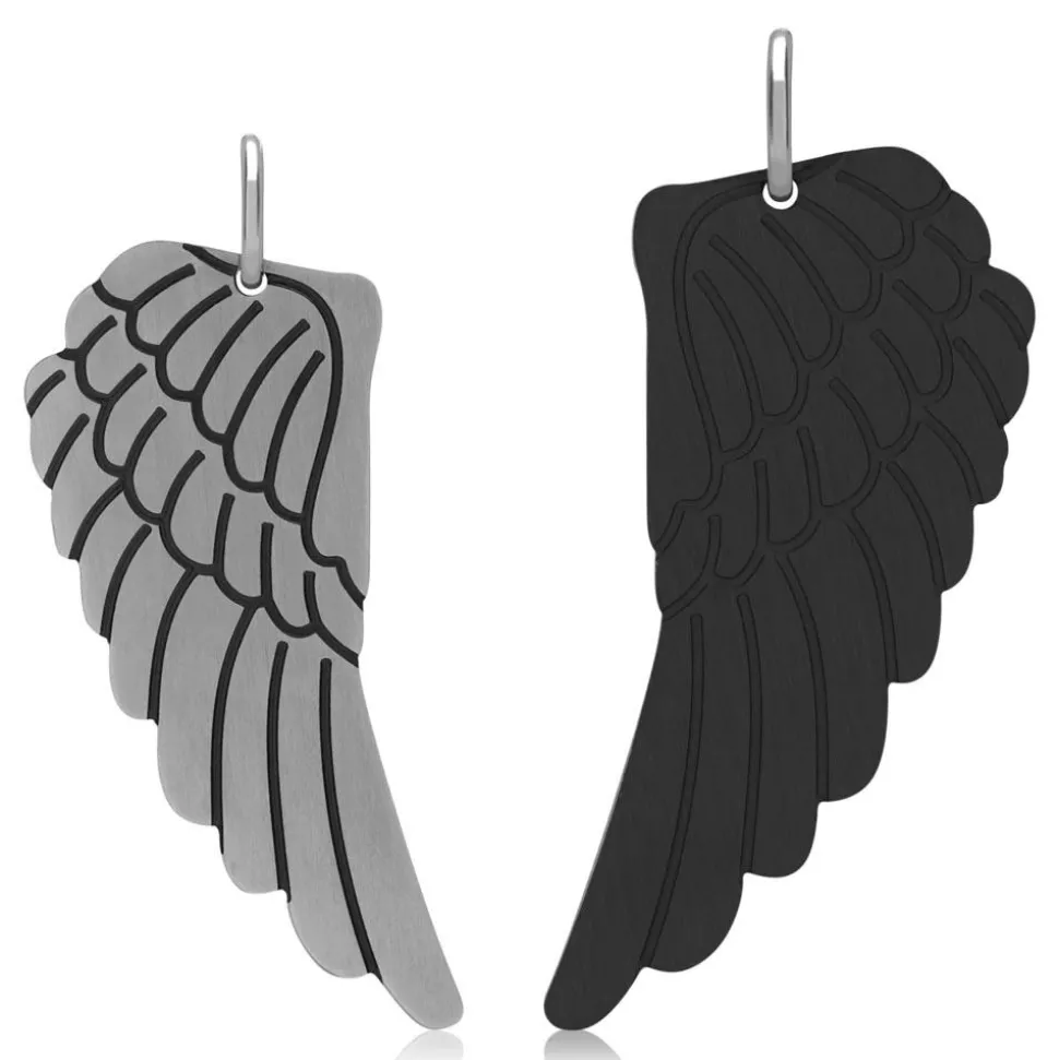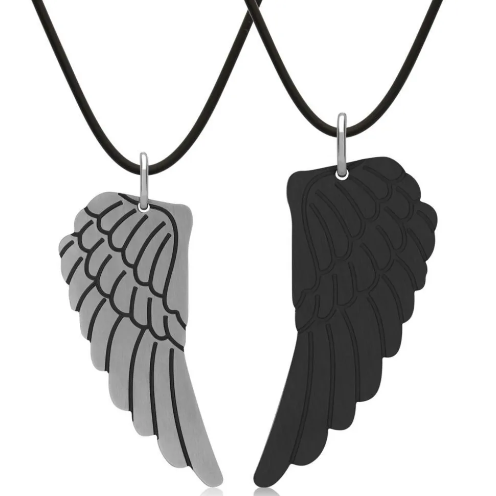 Ein dunkler und ein heller Flügel bilden dieses Partneranhänger-Set. Durch die strukturierte Oberfläche tritt das Flügel-Design besonders schön hervor. Die Anhänger sind aus Edelstahl gearbeitet und können als Partneranhänger oder auch als Freundschaftsanhänger getragen werden. Die glatte Oberfläche der Rückseite der Anhänger bietet sich für eine individuelle Gravur an. Entweder eine dezente Diamantgravur (siehe z.B. Bild 2) oder eine hochwertige Lasergravur (siehe z.B. Bild 3). Bitte beachten Sie zwecks Gravur: Anhänger 1 ist der in der Frontalansicht abgebildete linke Anhänger, Anhänger 2 ist der in der Frontalansicht abgebildete rechte Anhänger