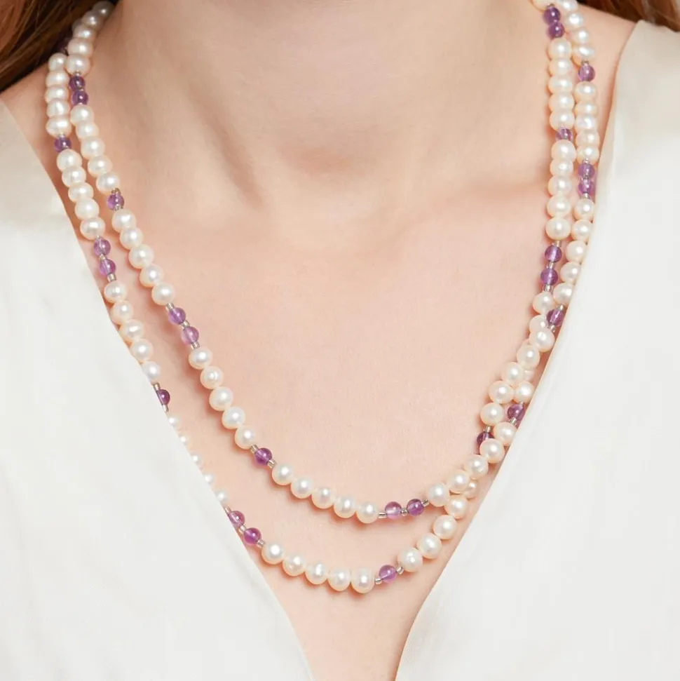 Hochwertige Halskette aus echten Süßwasserperlen. Die Kette besteht darüber hinaus aus Amethysten. Sie kann aufgrund ihrer Länge individuell nach Stil getragen werden.