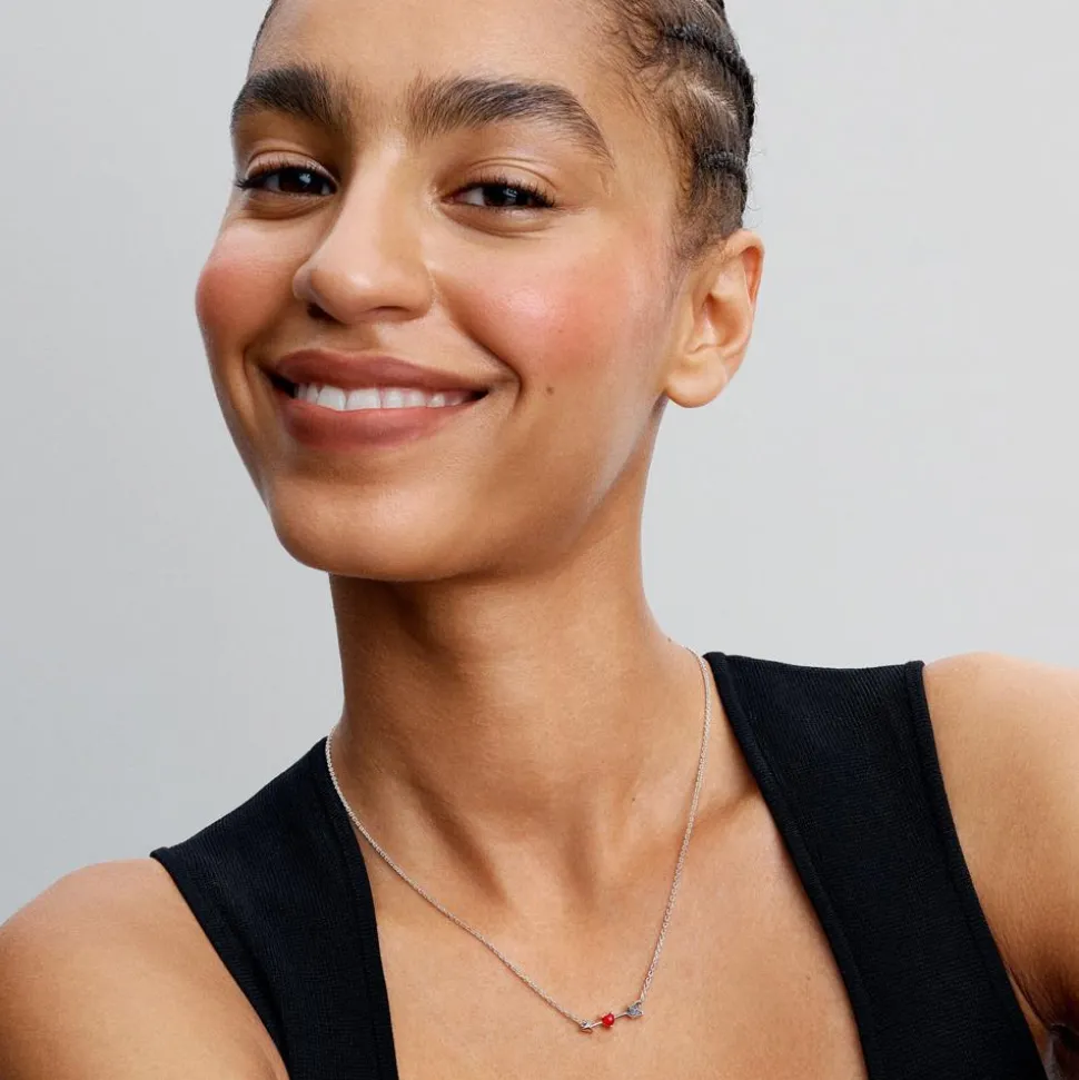 Ein umwerfender Eyecatcher – das ist diese Damenkette aus recyceltem Sterlingsilber. Sie verfügt über ein eingearbeitetes Schmuckelement, das einen Pfeil darstellt. Dieser ist am Ende mit funkelnden Zirkonia besetzt und weist in der Mitte ein Herz aus rotem Glas auf. Durch die Zwischenösen kann die Kette in der Länge verstellt werden. Zudem wird sie mit einem Karabiner verschlossen.