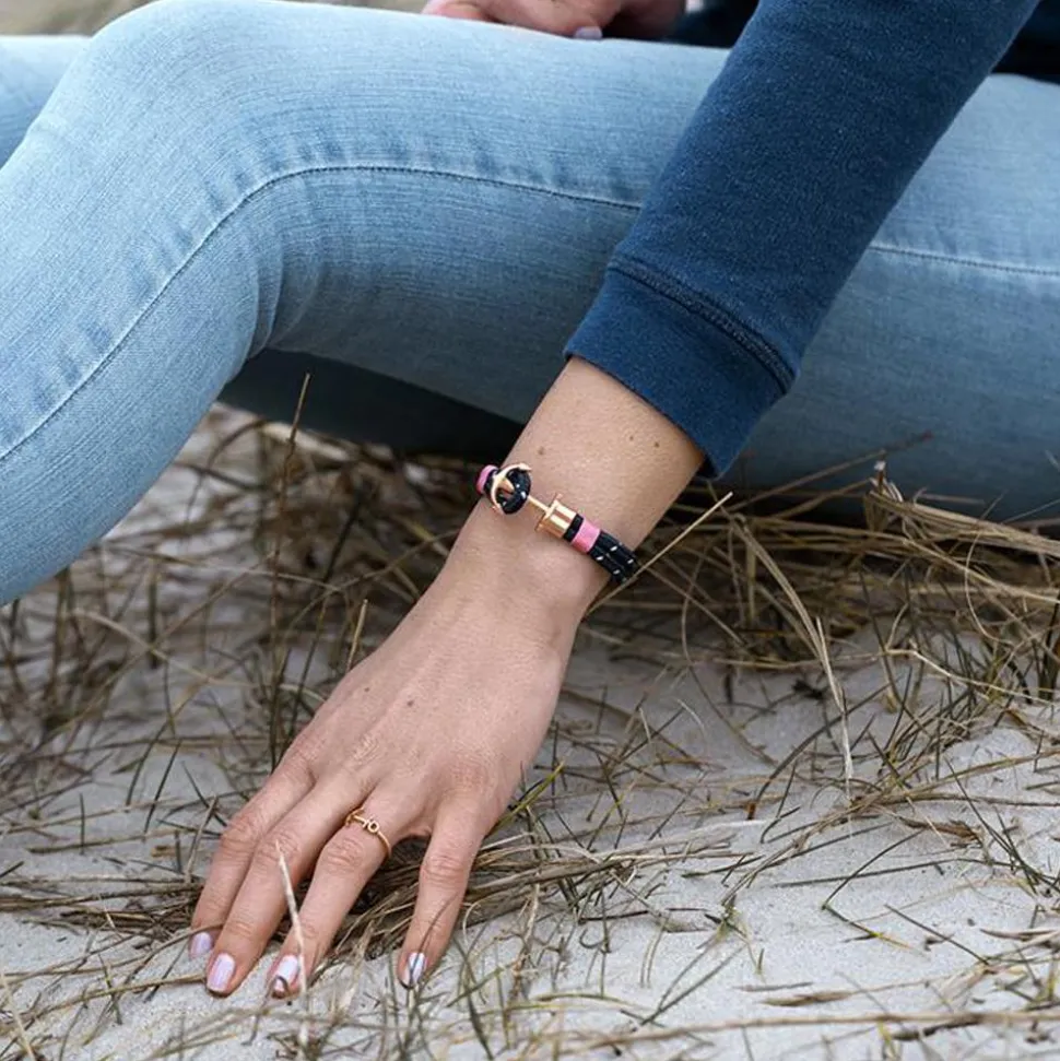 Lässig und feminin – das ist dieses zweireihige Armband aus dunkelblauem Nylon, welches mit weißen Fäden durchwebt ist. Zudem sind die Enden mit rosafarbenem Nylon umwickelt. Der markentypische Ankerverschluss ist aus rosévergoldetem Edelstahl gefertigt.