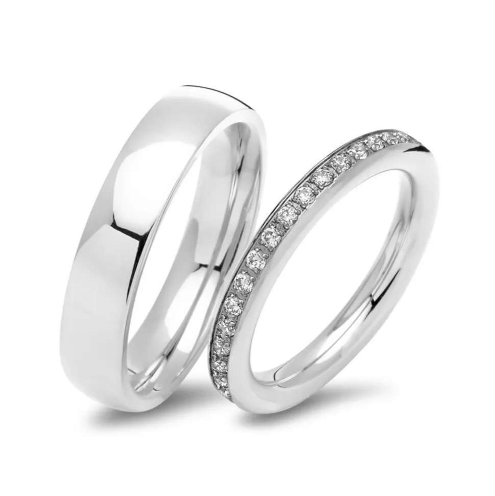 Hochwertiges Ehering-Set aus widerstandsfähigem Edelstahl mit polierter Oberfläche. Während der Herrenring sich durch klassische Eleganz auszeichnet wird der Damenring rundum von zahlreichen funkelnden Schmucksteinen geziert. Dank der Bombierung (=von Innen abgerundet) lassen sich die Ringe auch dauerhaft sehr komfortabel tragen. Im Angebot ist neben den Ringen auch ein Etui enthalten. Die Ringe können zudem als Verlobungsringe, Partnerringe oder Freundschaftsringe getragen werden. Breite Damenring 3,0 mm breite Herrenring 5,0 mm