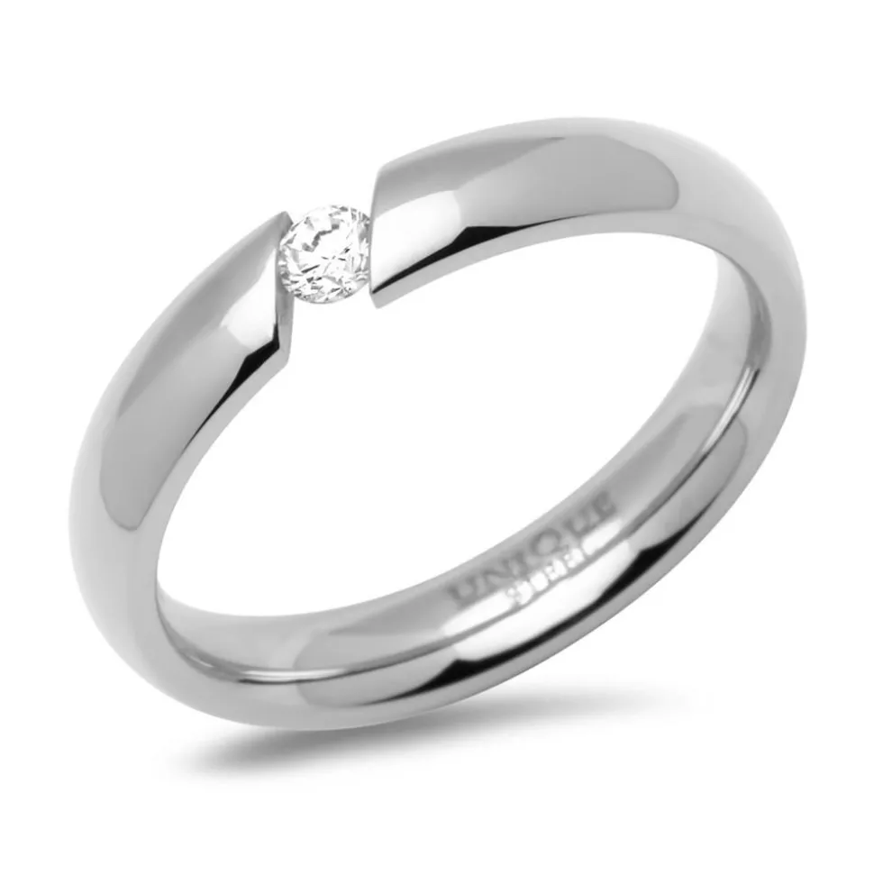 Hochwertiger Ring für Damen aus robustem Edelstahl mit polierter Oberfläche. Der Spannring besitzt einen geschliffenen Schmuckstein. Der Ring kann entlang seiner Innenseite per Laser graviert werden. Dank der Bombierung (=die Innenseite ist abgerundet) lässt sich der Ring sehr angenehm tragen. Lieferung inklusive Gratis-Etui.