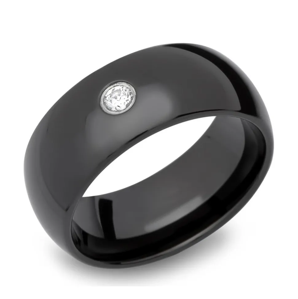 Hochwertiger Ring aus Wolfram in schwarzer Farbe. Der Ring besitzt zudem eine polierte Oberfläche, er ist 8mm breit. Der Ring ist mit einem glänzenden Zirkonia besetzt. Der Ring ist bombiert (von Innen abgerundet) und daher angenehm zu tragen. Der Ring kann per Laser auf seiner Innenseite sowie Außenseite graviert werden.