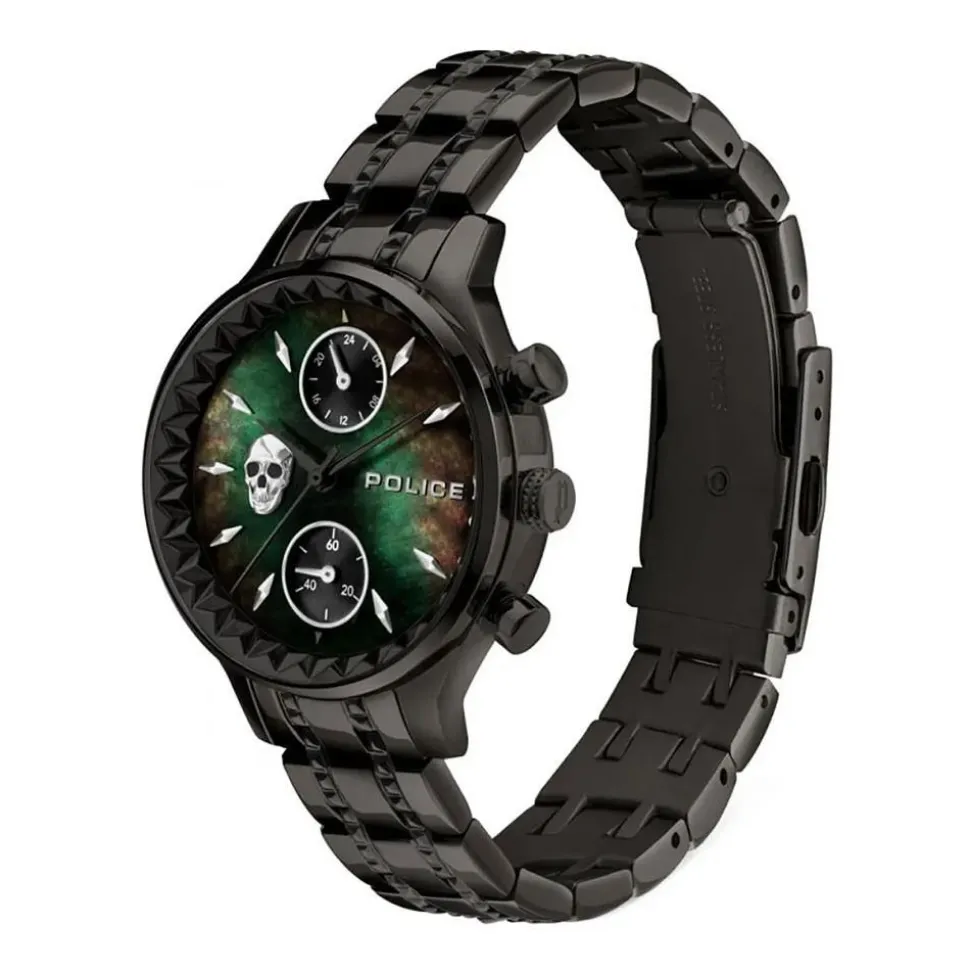 Absolut stylish – das ist diese Uhr für Damen aus schwarz-beschichtetem Edelstahl mit Quarzwerk. Das Zifferblatt besteht aus schimmerndem Perlmutt und besitzt neben einer Stoppfunktion einen Totenkopf als Zierde. Das Gliederband mit Nietendetails besitzt eine praktische Faltschließe und das Uhrengehäuse ist bis zu einem Druck von 3 bar wasserdicht.