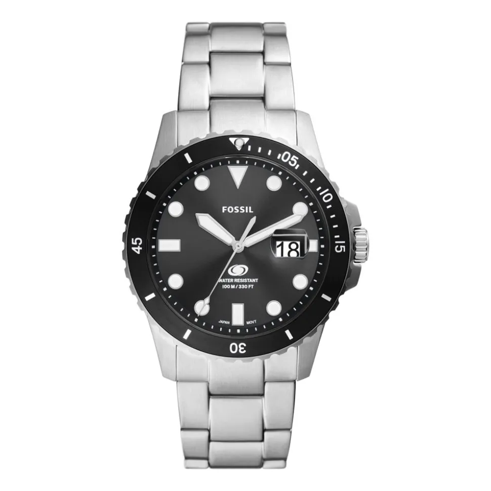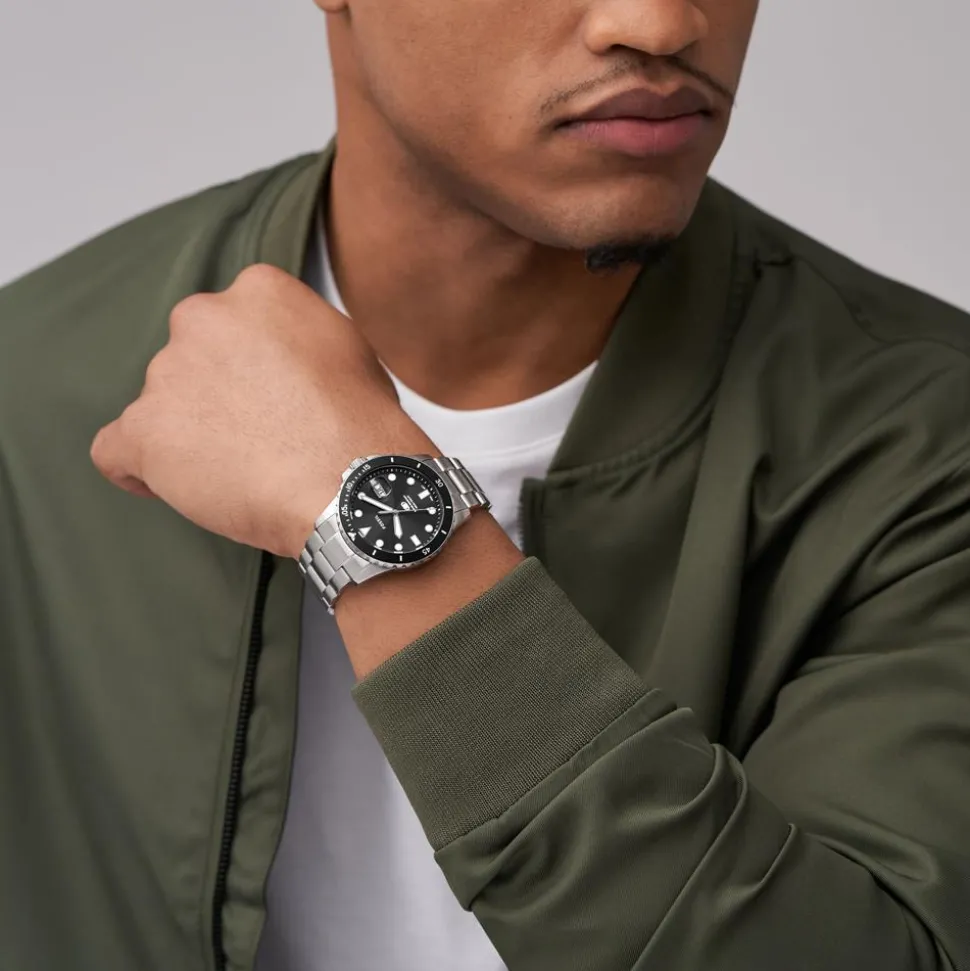 Diese Herrenuhr begeistert mit ihrem sportlichen Aussehen. Sie besteht aus mattiertem Edelstahl und besitzt einen präzisen Quarzantrieb. Das schwarze Zifferblatt ist mit einer Datumsanzeige versehen, die durch eine eingearbeitete Lupe im Uhrenglas gut lesbar ist. Zudem befinden sich noch lumineszierende Zeiger und Punktindizes auf dem Zifferblatt. Umgeben wird es von einer schwarzen Lünette mit Tachymeter, die drehbar ist. Das Gliederarmband wird mit einer Faltschließe sicher am Handgelenk verschlossen. Die Uhr ist bis zu 10 bar wasserdicht.