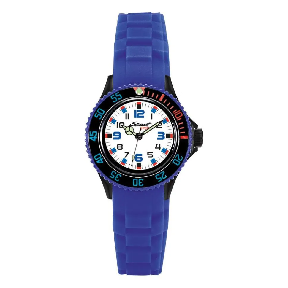 Diese Armbanduhr für Jungen besticht mit ihrem sportlichen Aussehen und der leuchtend blauen Farbe. Das dunkelblaue Kunststoffgehäuse mit Edelstahlboden besitzt ein Quarzuhrwerk und wird von einem blauen Silikonarmband gehalten. Das weiße Zifferblatt verfügt über lumineszierende Zeiger und wird von einer drehbaren, schwarzen Lünette mit Tachymeter umgeben. Rote und blaue Details zieren zudem das Zifferblatt und die Lünette. Die Uhr ist Teil der Serie „The Scout“ und bis zu einem Druck von 5 bar wasserdicht. Das Armband wird mit einer Dornschließe geschlossen.