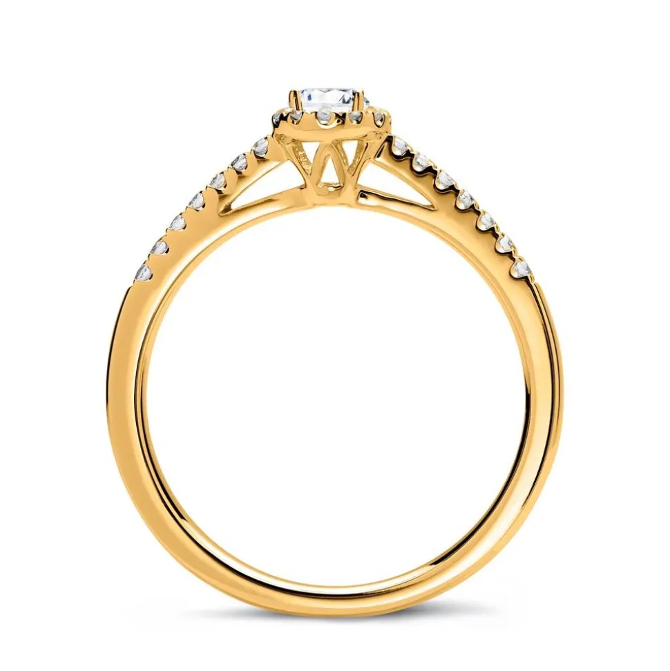 Der Kranz aus Diamanten auf dem Ringkopf macht aus einem Ring einen klassischen Halo-Ring. Bei diesem filigranen Ring aus hochglanzpoliertem Gold (14 Karat) wird sowohl der Ringkopf als auch ein Teil der Ringschiene von insgesamt 26 brillantgeschliffenen Diamanten (ca. 0,16 ct.) in Pavéfassung geziert. Die Farbe der Steine ist klassifiziert als Feines Weiß (Top Wesselton) und die Reinheit der Steine fällt in die Kategorie SI (small inclusions). Das Highlight des Ringes ist der Hauptdiamant (ca. 0,10 ct.). Neben höchsten Qualitätsstandards, die wir bei jedem einzelnen Schmuckstück von Hand prüfen, achten wir auch auf ethische Aspekte. Deshalb stammen unsere Diamanten ausschließlich aus konfliktfreien Quellen. Die Innenseite der Ringschiene kann mit einer Wunschgravur versehen werden.