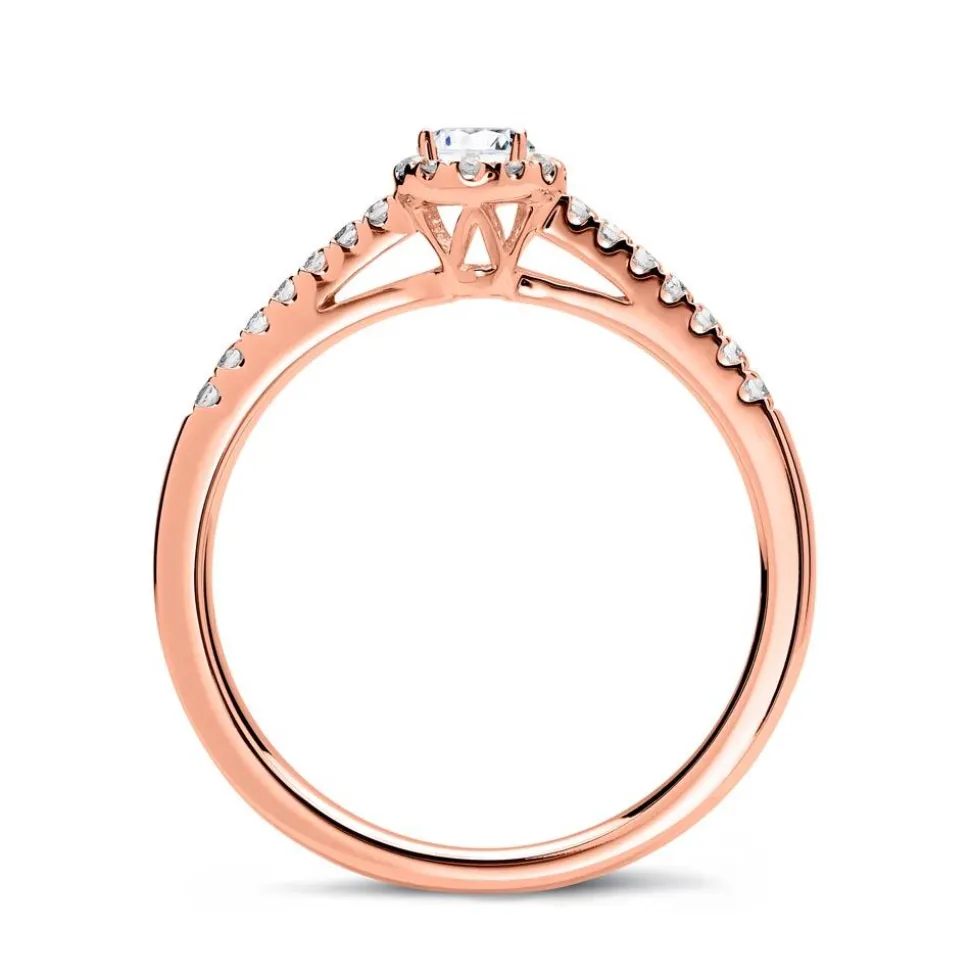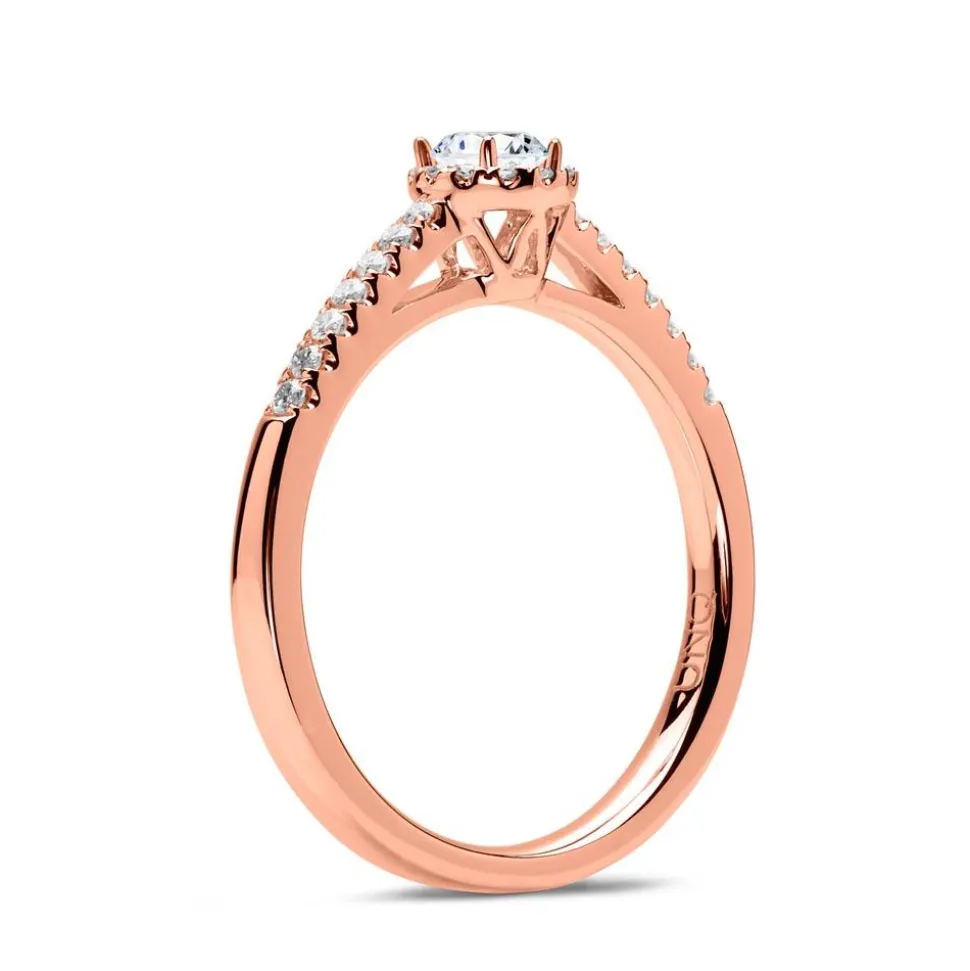Der Kranz aus Diamanten auf dem Ringkopf macht aus einem Ring einen klassischen Halo-Ring. Bei diesem filigranen Ring aus 750er Roségold wird sowohl der Ringkopf als auch ein Teil der Ringschiene von insgesamt 26 brillantgeschliffenen Diamanten (ca. 0,16 ct.) in Pavéfassung geziert. Die Farbe der Steine ist klassifiziert als Feines Weiß (Top Wesselton) und die Reinheit der Steine fällt in die Kategorie SI (small inclusions). Das Highlight des Ringes ist der Hauptdiamant (ca. 0,10 ct.). Neben höchsten Qualitätsstandards, die wir bei jedem einzelnen Schmuckstück von Hand prüfen, achten wir auch auf ethische Aspekte. Deshalb stammen unsere Diamanten ausschließlich aus konfliktfreien Quellen. Die Innenseite der Ringschiene kann mit einer Wunschgravur versehen werden.