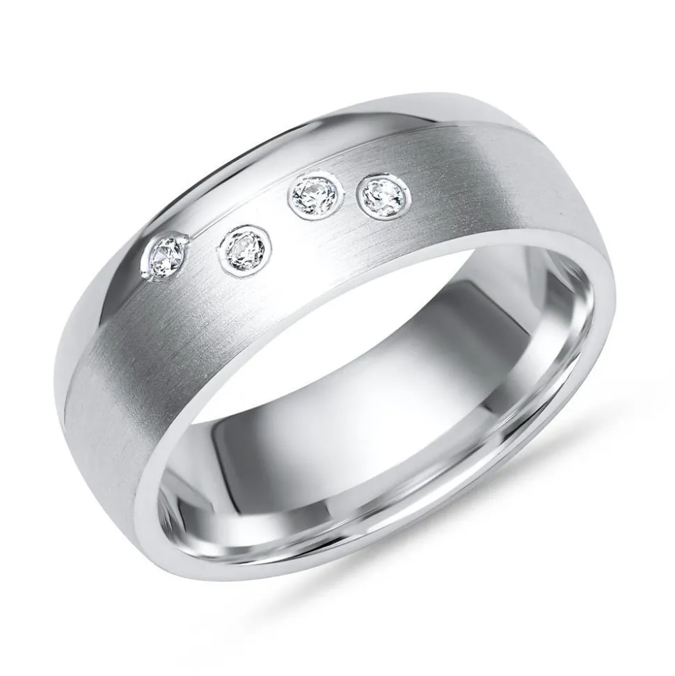 Hochwertiger Damenring aus anlaufgeschütztem 925 Sterlingsilber mit teilpolierter sowie teilmattierter Oberfläche. Der Ring wird darüber hinaus von vier Zirkonia geziert. Der Ring kann kostenlos wahlweise von Innen oder Aussen mit einer Lasergravur versehen werden.