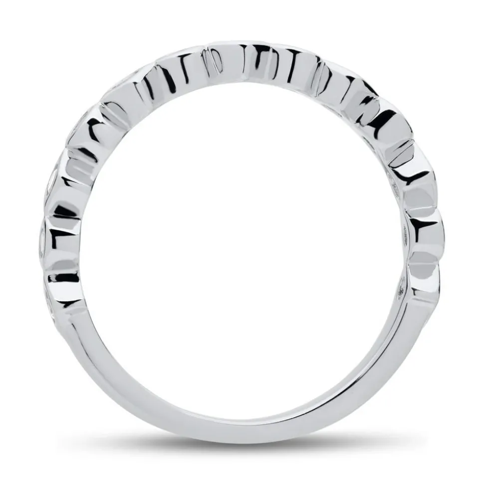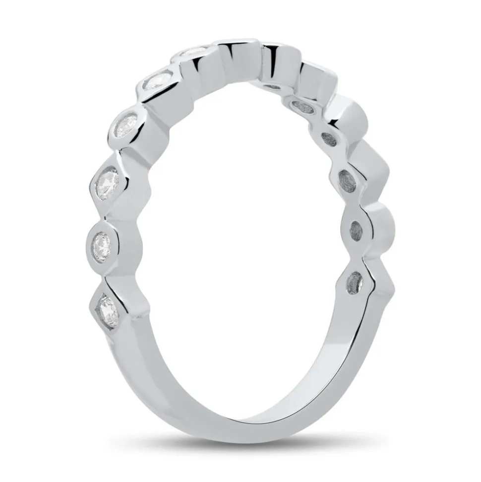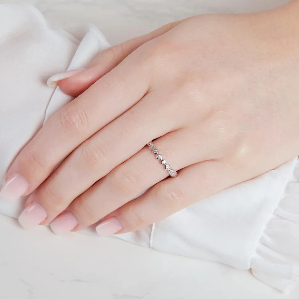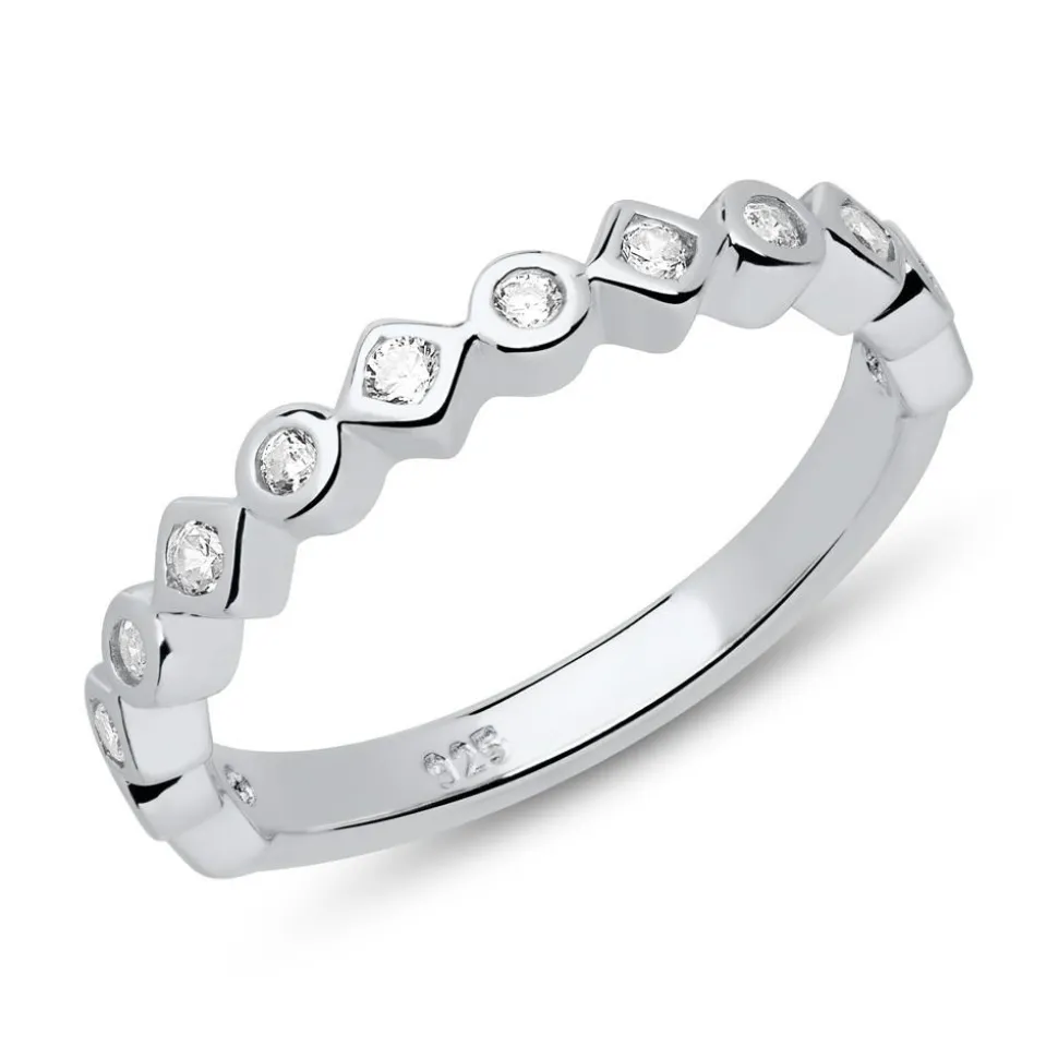 Die in 925er Sterlingsilber gefassten Zirkoniasteine bringen durch ihr edles Funkeln die Eleganz dieses Damenringes noch besser zur Geltung. Zusammen mit dem abwechslungsreichen Design aus Kreisen und kleinen Quadraten, in welchen die weiß-funkelnden Zirkoniasteine gefasst sind, entsteht eine ansprechende Gesamtkomposition. Zudem kann die Innenseite des Ringes von uns mit einer individuellen Gravur versehen werden. Dadurch, dass die Designelemente nur die Hälfte des filigranen Ringes zieren, wird ein angenehmer Tragekomfort gewährleistet. Zudem ist er rhodiniert und somit anlaufgeschützt.