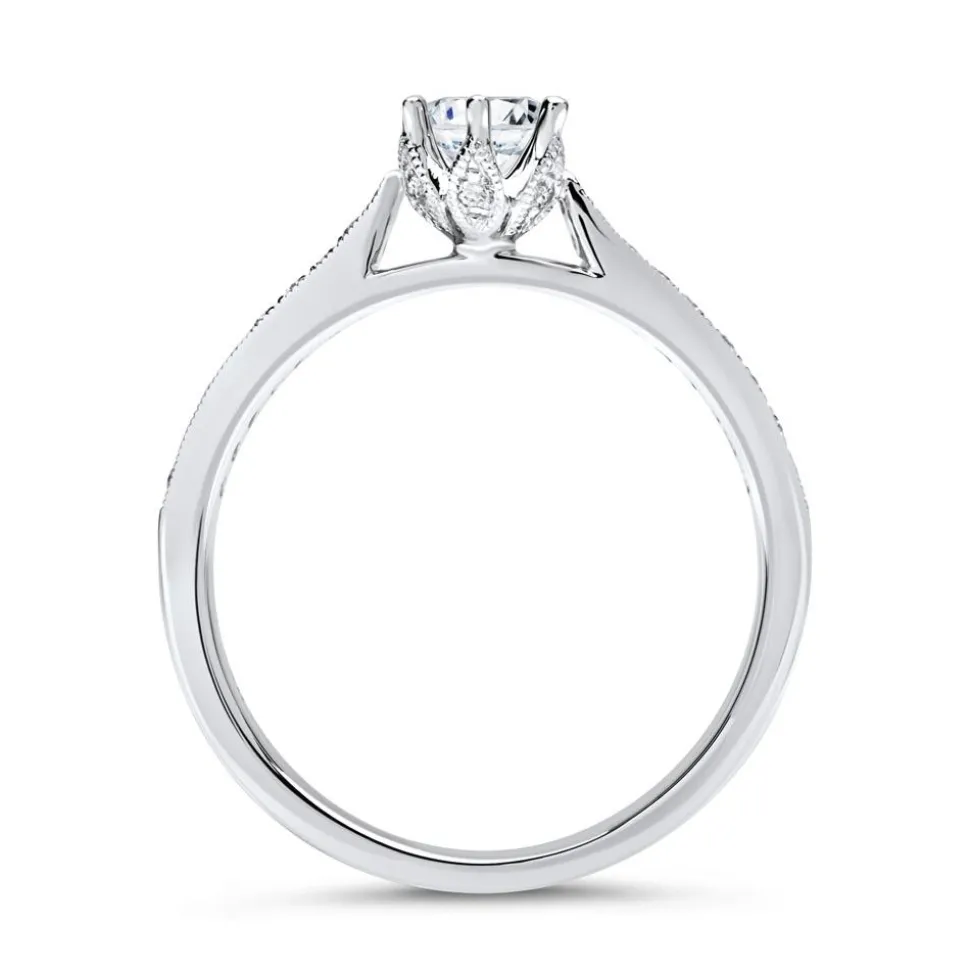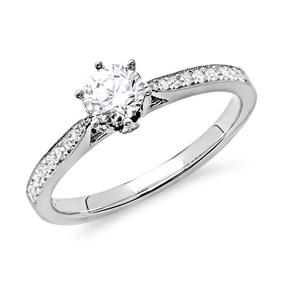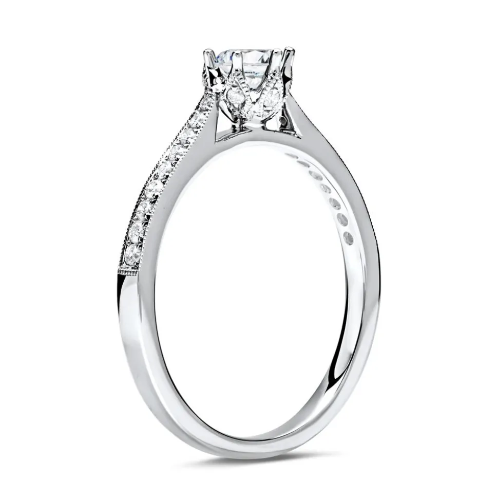 Dieser Ring aus rhodiniertem 950er Platin ist ein absoluter Blickfang: Der Ringkopf erinnert an eine Krone oder an den Blütenkelch eines Krokusses und ist, wie auch die Hälfte der Ringschiene, mit pavégefassten Brillanten (insgesamt 24; 0,17 ct.) besetzt. Der Hauptstein (ca. 0,50 ct.) im Brillantschliff wird dadurch besonders hervorgehoben. Die Farbe der Brillanten ist klassifiziert als Feines Weiß (Top Wesselton) und die Reinheit der Steine fällt in die Kategorie SI (small inclusions). Durch unseren Gravurservice kann auf Wunsch die Innenseite des Ringes mit einer persönlichen Widmung, einem Namen oder einem Datum versehen werden. Die schmale Ringschiene sorgt für ein angenehmes Tragegefühl. Wir legen bei unserem Diamantschmuck nicht nur Wert auf eine exzellente Qualität, sondern auch auf ethische Aspekte. Deshalb stammen unsere Diamanten ausschließlich aus konfliktfreien Quellen. Der Hauptdiamant ist von dem renommierten Gemological Institute of America (GIA) zertifiziert. Dieses Zertifikat gibt Auskunft über die Herkunft, Echtheit und alle weiteren wertbestimmenden Merkmale.