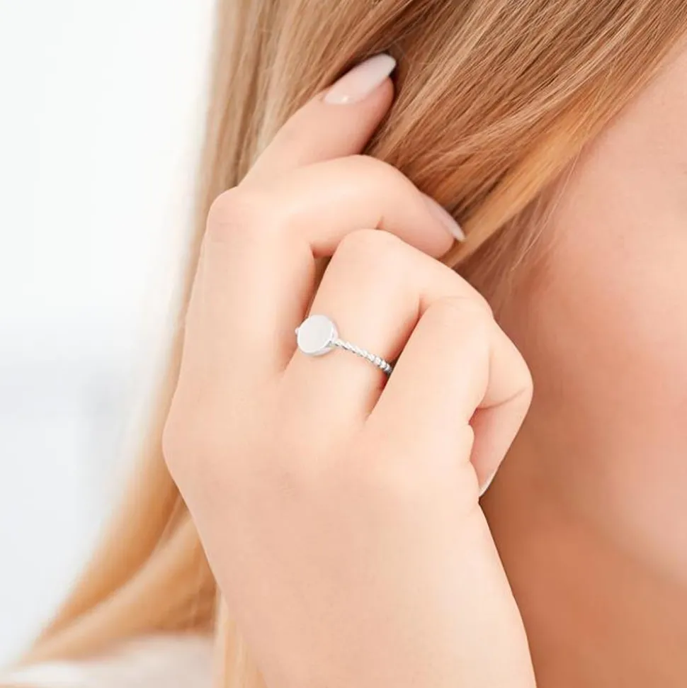 Dieser Ring begeistert mit seinem modernen Design und der Möglichkeit ihn zu individualisieren. Er ist aus Sterlingsilber gefertigt, welches durch die Rhodinierung anlaufgeschützt ist. Die Ringschiene besitzt ein trendstarkes Kugeldesign und der runde Ringkopf kann mit einer Gravur vesehen werden – perfekt für Initialen.