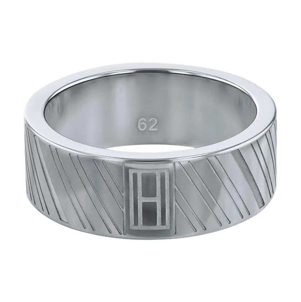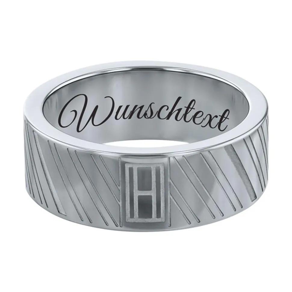 Dieser Bandring begeistert mit seinem gradlinig-modernen Design. Er besteht aus kratzfestem Edelstahl und wird von Linien und dem Markenlogo geziert. Zudem kann die Innenseite von uns mit einer individuellen Wunschgravur versehen werden.