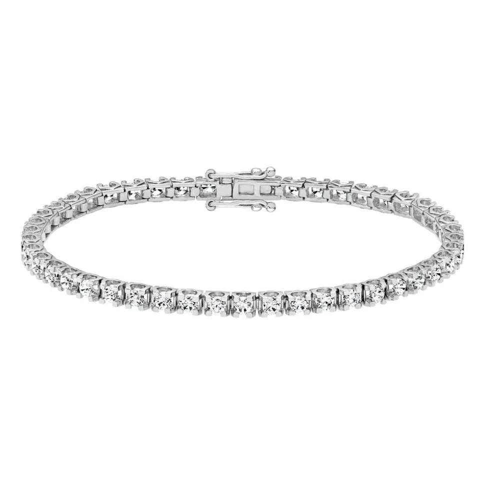 Dieses Tennisarmband für Damen begeistert mit seinem stilvollen Design. Erhältlich sowohl in Weißgold (585er oder 750er) als auch in 950er Platin, kann die bevorzugte Legierung ganz einfach über das Drop-down-Feld ausgewählt werden. Das Armband wird von 47 lab-grown Diamanten (insgesamt ca. 2,90 ct.) geziert, die sich eng aneinandergereiht in Krappenfassungen befinden. Diese besitzen an den Seiten runde Aussparungen, wodurch viel Licht auf die Diamanten fällt und sie zum Funkeln bringt. Alle Diamanten stammen aus dem Labor, unterscheiden sich in ihren wertbestimmenden Eigenschaften jedoch nicht von natürlichen Diamanten. Ihre Farbe ist als D-F klassifiziert und ihre Reinheit gehört in die Kategorie VVS-VS. Das Brilladia-Zertifikat gibt Auskunft über alle wichtigen Merkmale der lab-grown Diamanten. Der Steckverschluss reiht sich nahtlos in das Armband ein und ist für zusätzliche Sicherheit noch auf beiden Seiten mit einer sogenannten Sicherheitsacht versehen.