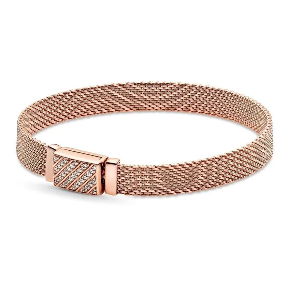 Das Milanaise-Armband besteht aus einer hochwertigen Metalllegierung, welche mit 14 Karat Roségold plattiert wurde. Der lange Clip-Verschluss ist auf der Vorderseite mit diagonal angeordneten Zirkona Steinen besetzt. Auf der Rückseite ist das Pandora-Logo zu sehen. Das Armband ist ausschließlich mit Elementen aus der Reflexions-Serie kombinierbar. Bitte bei der Größenauswahl ca. 1 cm zu dem Handgelenksumfang addieren, je nach Anzahl der Reflexions-Elemente, die daran getragen werden sollen.