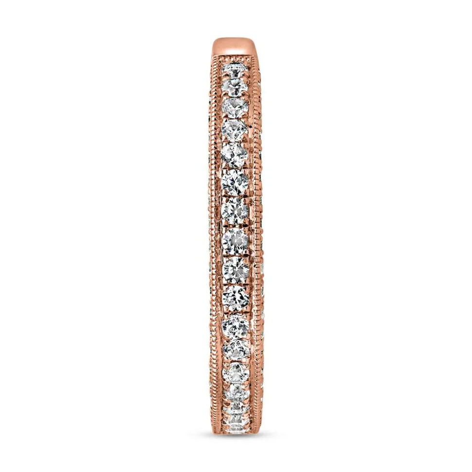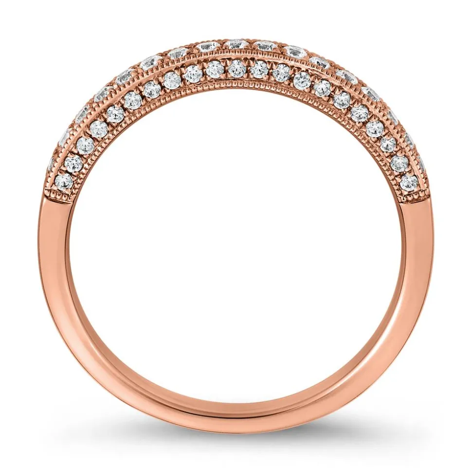 Dieser kunstvolle Ring aus 585er oder 750er Roségold besticht durch eine traumhafte Optik. Insgesamt 59 Labordiamanten im Brillantschliff zieren die Oberseite und die Seiten der Ringschiene in der vorderen Hälfte. Sie haben ein Gesamtgewicht von ca. 0,35 ct. und funkeln in der Farbe „River“ bis „Top Wesselton“. Ihre Reinheit gehört zur Kategorie „very, very small inclusions“ bis „very small inclusions“. Die sicher in Krappen eingefassten Steine bieten zusammen mit der feinen Perlierung an den Außenseiten des Rings ein elegantes Gesamtbild. Sie bestehen zu 100 % aus Kohlenstoff und sind in ihren wertbestimmenden Eigenschaften wie Härte und Brillanz identisch mit herkömmlichen Diamanten. Über das Drop-down-Menü kann die Legierung gewählt und eine persönliche Gravur hinzugefügt werden.