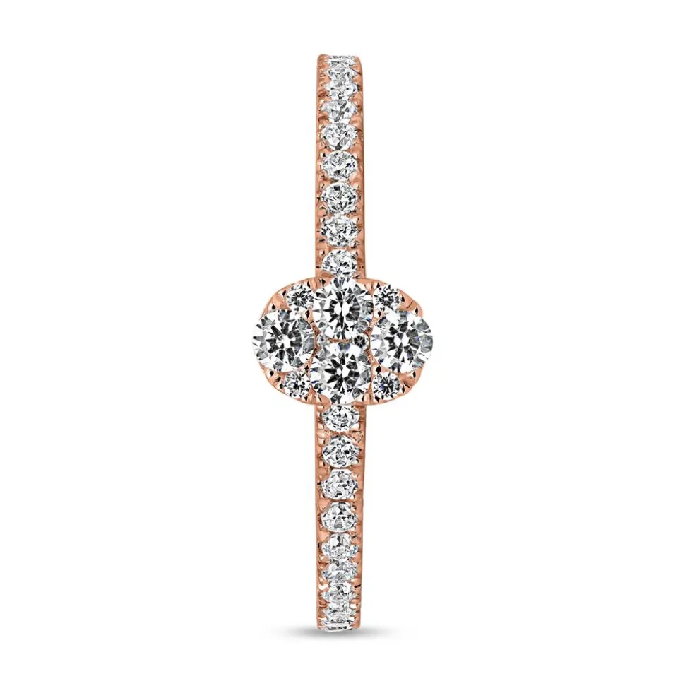 Ein wundervoller Diamantring aus hochwertigem Roségold, erhältlich in 14 oder 18 Karat. Die Auswahl kann über die Drop-down-Liste vorgenommen werden. Der ovale Ringkopf wird von brillantgeschliffenen Diamanten in Pavéfassung geziert, während die vordere Ringschiene durch krappengefasste Brillanten ergänzt wird. Insgesamt zieren 30 Diamanten mit ca. 0,35 ct. Gesamtgewicht das Schmuckstück. Die Diamanten überzeugen durch ihre Farbe „Top Wesselton“ und die Reinheit „small inclusions“. Sie stammen selbstverständlich aus konfliktfreien Quellen. Eine Gravur auf der Innenseite kann dem Ring eine persönliche Note verleihen.