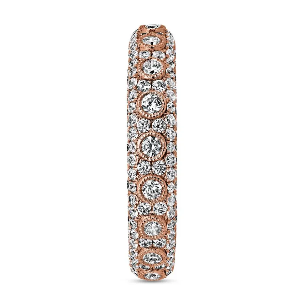 Dieser Diamantring für Damen zeichnet sich durch sein apartes Erscheinungsbild aus. Er ist entweder in 585er oder in 750er Roségold verfügbar, das sich ganz bequem über die Drop-down-Liste auswählen lässt. Für traumhaftes Funkeln sorgen die 129 Diamanten im Brillantschliff, die die vordere Hälfte der Ringschiene zieren. Dabei sind 9 größere Diamanten nebeneinander aufgereiht und besitzen jeweils eine perlierte Fassung. Umgeben werden diese von mehreren unterschiedlich großen Brillanten in einem Pavé. Das Pavé wird ebenfalls von einer Perlierung umrahmt. Die 129 Brillanten weisen eine Gesamtkaratzahl von ca. 0,79 ct. auf und zeichnen sich durch die Reinheit SI (small inclusions) und die Farbe TW (Top Wesselton) aus. Zudem stammen unsere Diamanten ausschließlich aus konfliktfreien Bezugsquellen. Gerne können unsere Graveure noch eine Innengravur hinzufügen.