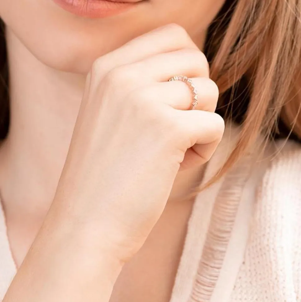 Die in rosévergoldetem 925er Sterlingsilber gefassten Zirkoniasteine bringen durch ihr edles Funkeln die Eleganz dieses Damenringes noch besser zur Geltung. Zusammen mit dem abwechslungsreichen Design aus Kreisen und kleinen Quadraten, in welchen die weiß-funkelnden Zirkoniasteine gefasst sind, entsteht eine ansprechende Gesamtkomposition. Zudem kann die Innenseite des Ringes von uns mit einer individuellen Gravur versehen werden. Dadurch, dass die Designelemente nur die Hälfte des filigranen Ringes zieren, wird ein angenehmer Tragekomfort gewährleistet.