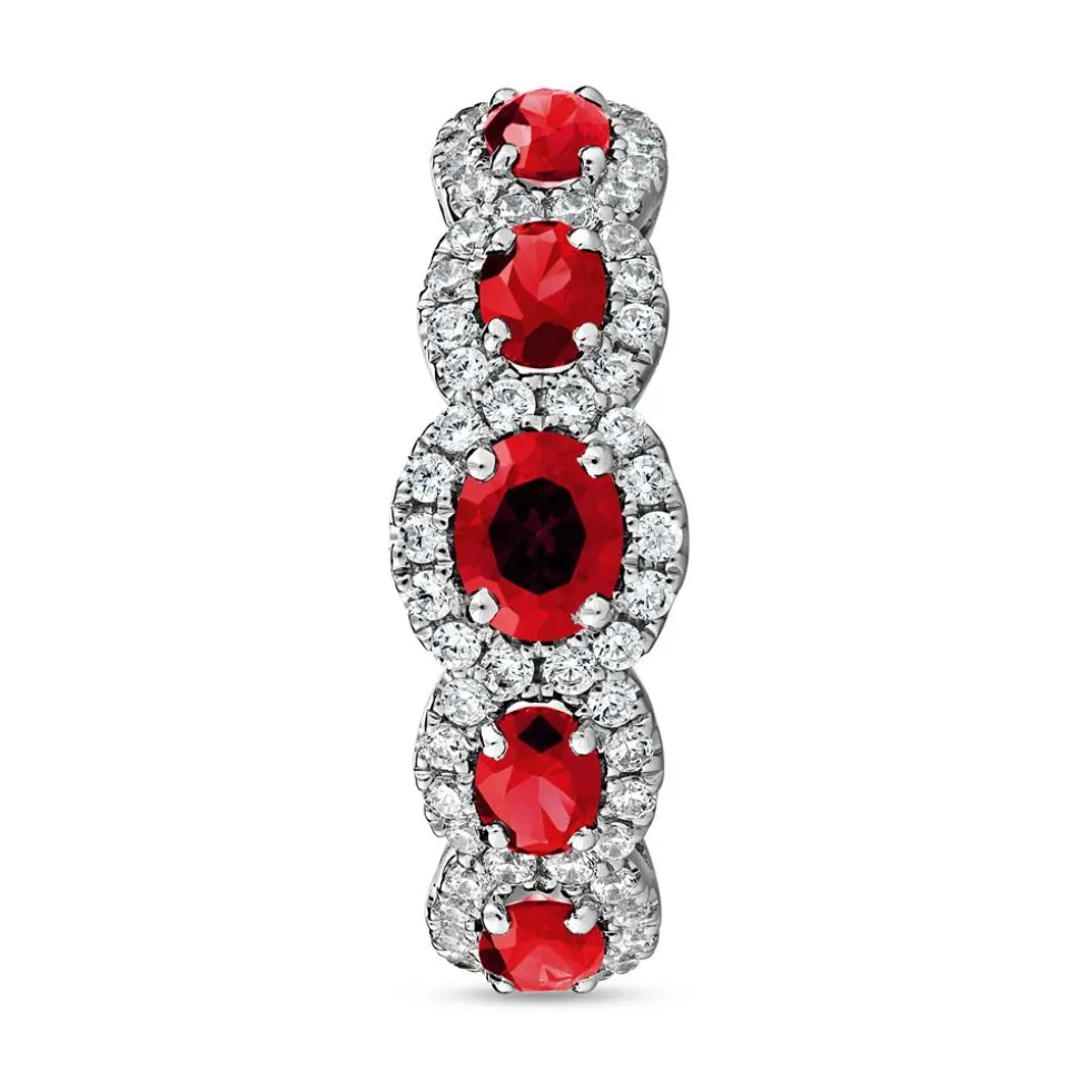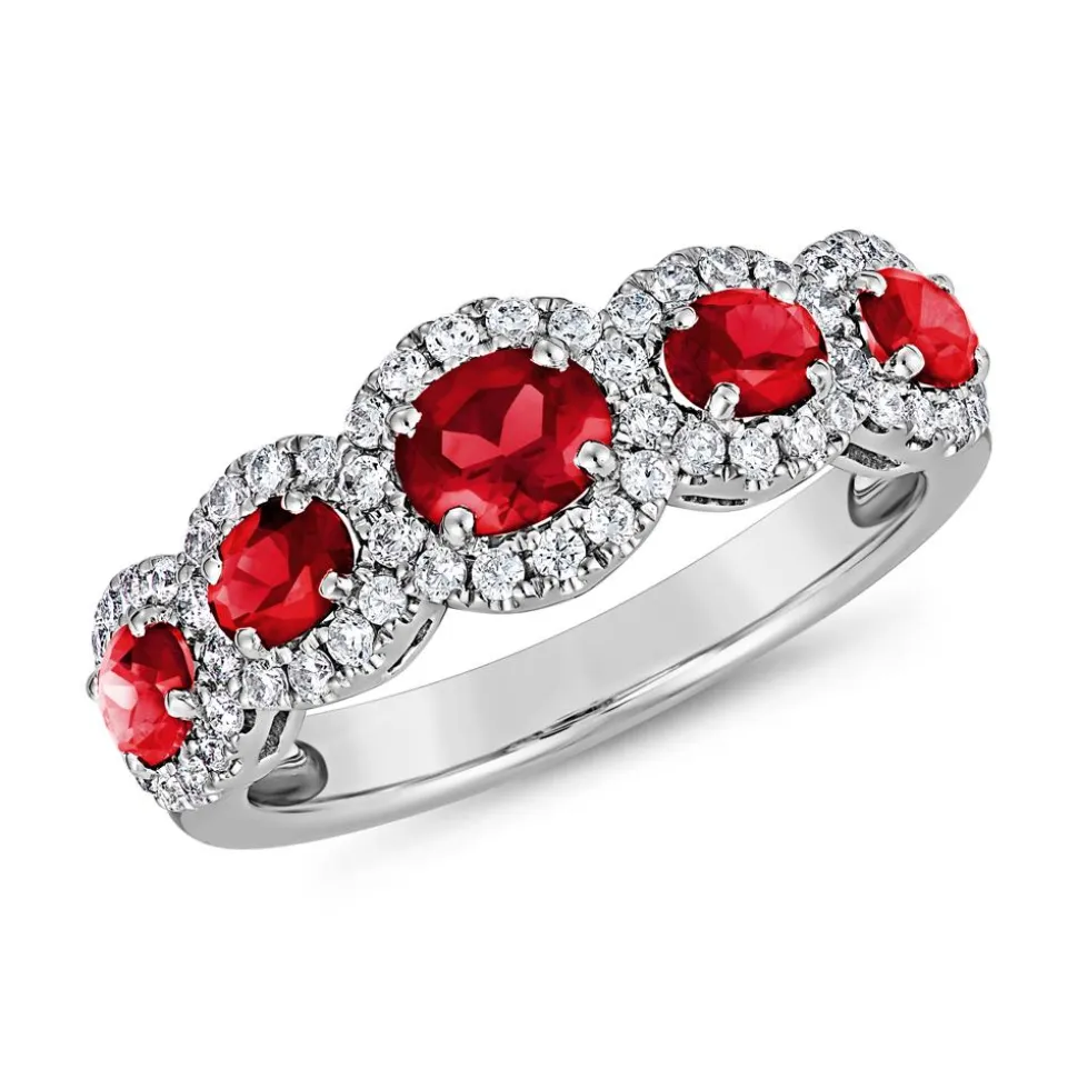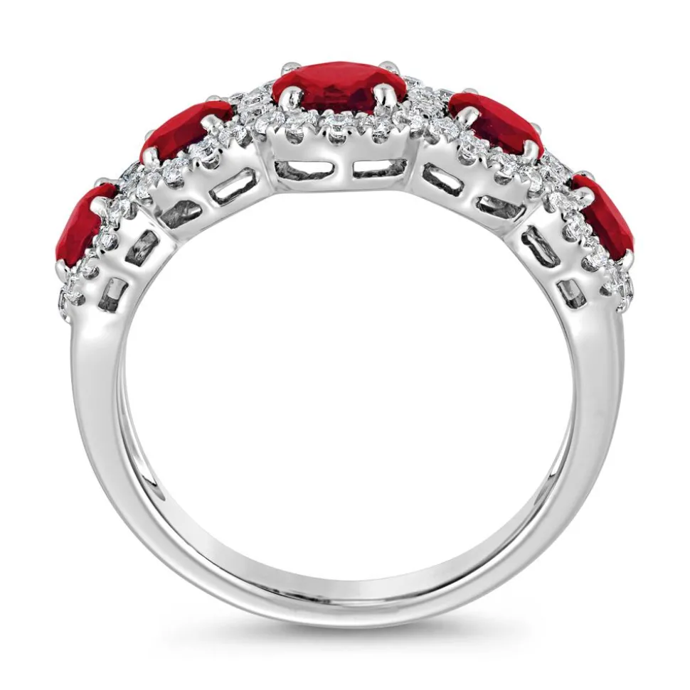 Dieser Ring für Damen besticht mit seinem edlen Farbkontrast zwischen dem kühlen Silberton des Ringes und dem tiefroten Steinbesatz. Er ist wahlweise aus 585er oder 750er Weißgold oder 950er Platin gefertigt. Bitte die bevorzugte Legierung im Drop-down-Feld auswählen. Der vordere Teil der Ringschiene ist mit 5 Rubinen (gesamt ca. 1,65 ct.) besetzt, wovon der mittlere Stein der größte ist. Zusätzlich werden sie von brillantgeschliffenen Diamanten (insgesamt: 50; zusammen ca. 0,39 ct.) umrahmt. Die Farbe dieser fällt in die Kategorie Top Wesselton und die Reinheit ist mit SI klassifiziert. Unsere Diamanten stammen ausschließlich aus konfliktfreien Quellen. Die Innenseite der Ringschiene kann mit einer individuellen Gravur versehen werden.