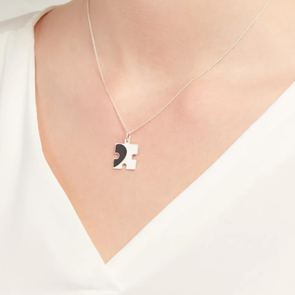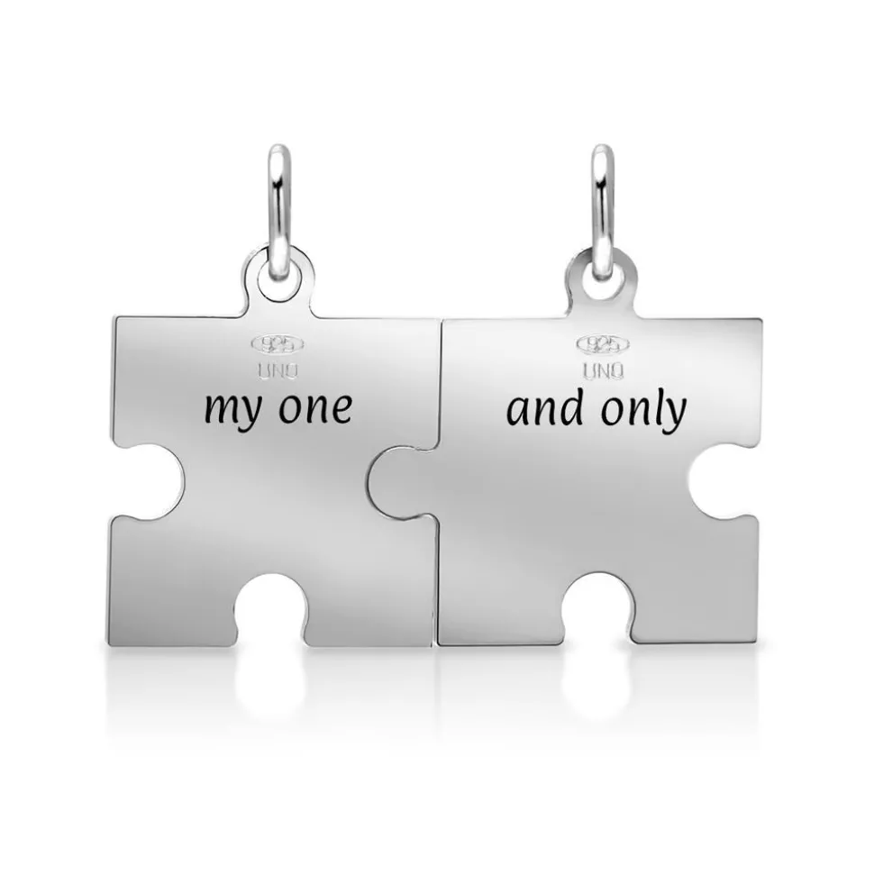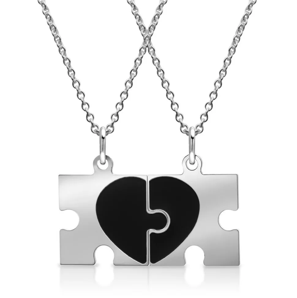 Filigrane Partneranhänger aus echtem 925er Sterlingsilber mit glänzender Oberfläche. Das Anhänger-Set besteht aus zwei Puzzleteilen, auf deren Vorderseite ein schwarzes Herz lackiert ist. Sie besitzen zusammengenommen eine Breite von 30mm. Sie können den Anhängern zudem mitteils einer Rückseitengravur eine ganz persönliche Note verleihen. Dabei haben Sie Wahl zwischen einer dezenten Diamantgravur, zu sehen auf dem zweiten Bild, sowie einer besonders hochwertigen Lasergravur, zu sehen auf dem dritten Bild. Darüber hinaus besteht die Möglichkeit, eine oder zwei der abgebildeten Ketten zu erwerben. Bitte beachten Sie zwecks Gravur: Anhänger 1 ist der in der Frontalansicht abgebildete linke Anhänger, Anhänger 2 ist der in der Frontalansicht abgebildete rechte Anhänger