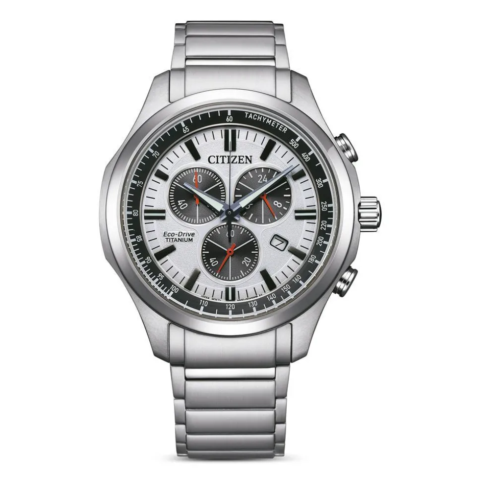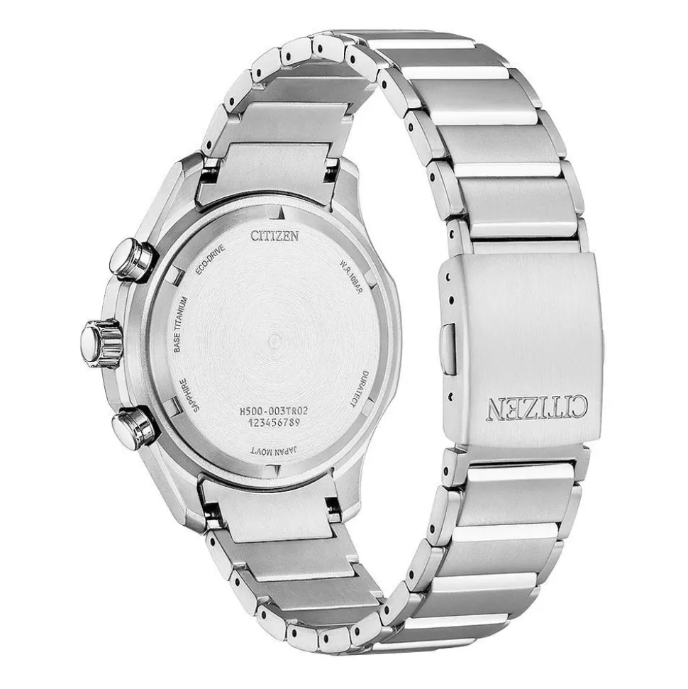 Ein moderner Begleiter – das ist diese Armbanduhr für Herren. Sie besitzt ein solarbetriebenes Quarzuhrwerk mit einer Gangreserve von 150 Tagen. Das Gehäuse und Armband der Uhr sind aus mattem Super Titanium gefertigt, welches perfekt mit dem weißen Zifferblatt harmoniert. Auf dem Zifferblatt befinden sich lumineszierende Zeiger, Strichindizes sowie eine Datums- und 24-Stundenanzeige. Außerdem verfügt die Uhr über zwei Chronoaugen für die Stoppfunktion und ein innenliegendes Tachymeter. Geschützt wird das Zifferblatt von kratzfestem Saphirglas. Die Uhr ist bis zu einem Druck von 10 bar wasserdicht und wird mit einer Sicherheitsfaltschließe verschlossen.